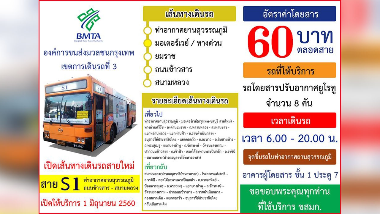 ขณะที่เพจรถเมล์ไทย รายงานว่า ขสมก. เขตการเดินรถที่ 3 ซึ่งจะเปิดให้บริการรถเมล์สาย S1 ในวันที่ 1 มิ.ย. ได้มีการจัดรถโดยสารปรับอากาศยูโรทูจำนวน 8 คัน เก็บอัตราค่าโดยสารคนละ 60 บาทตลอดสาย วิ่งรับ-ส่งถึงอาคารผู้โดยสารในท่าอากาศยานสุวรรณภูมิ ที่อาคารผู้โดยสาร ชั้น 1 ประตู 7