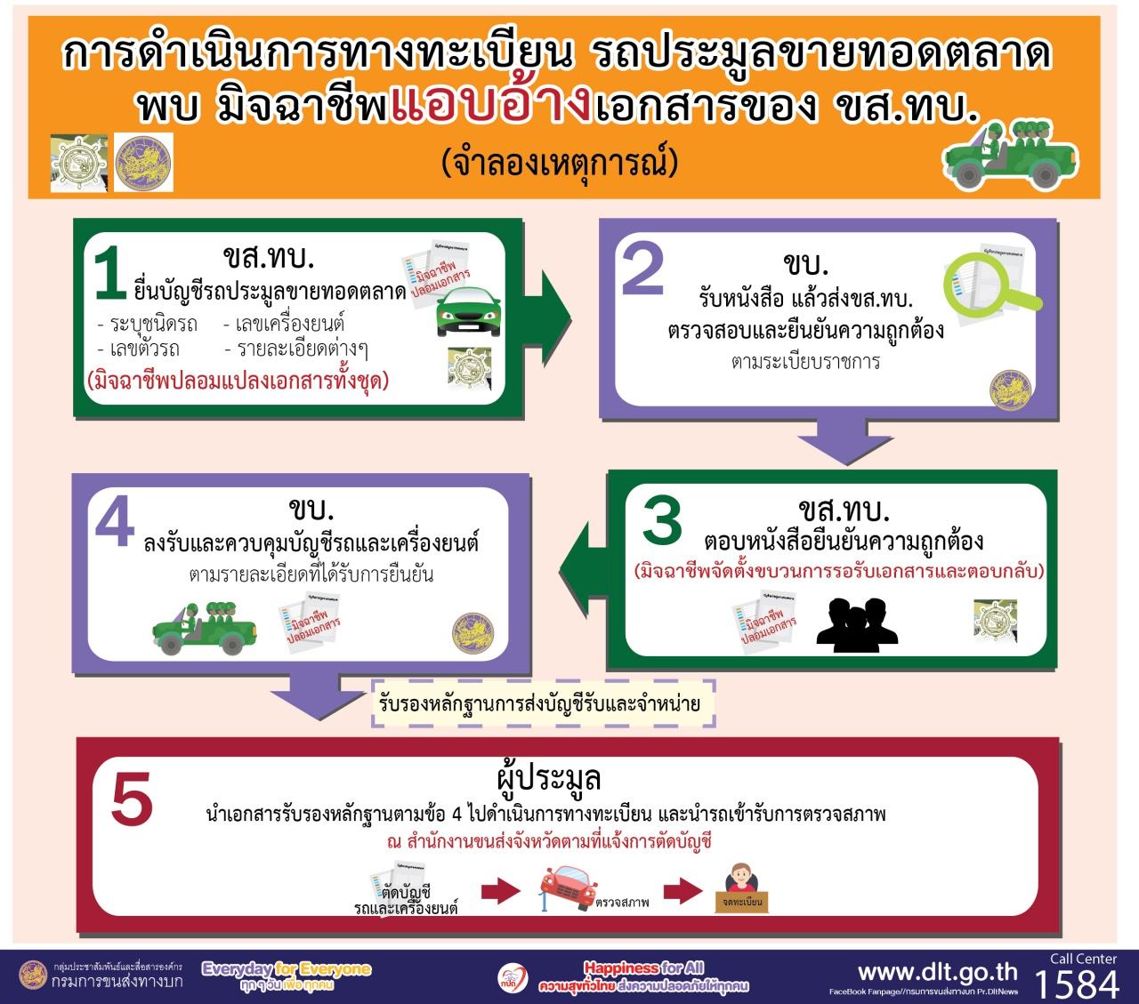 ทั้งนี้ ระบบราชการเมื่อมีการรับเอกสารส่งบัญชีรถแจ้งการประมูลขายทอดตลาด หน่วยงานราชการ ขบ. จะส่งหนังสือราชการถามกลับไปยังหน่วยงานต้นสังกัด เพื่อตรวจสอบความถูกต้องของรายละเอียดทุกครั้ง และเมื่อได้รับหนังสือตอบกลับตามระบบราชการ จึงจะเข้าสู่ขั้นตอนการดำเนินการทางทะเบียนต่อไป ซึ่งจากการดำเนินการตามระเบียบราชการของรถประมูลขายทอดตลาดของ ขส.ทบ. พบว่า ผู้ปลอมแปลงเอกสารราชการมีขบวนการบริหารจัดการเพื่อแจ้งหนังสือกลับตามระเบียบราชการทุกขั้นตอน จนนำไปสู่การดำเนินการทางทะเบียนต่อไปได้ ส่งผลให้มีรถที่จดทะเบียนจากการยื่นเอกสารบัญชีเท็จไป 605 คัน กระจายจดทะเบียนไปในจังหวัดต่างๆ โดยจดทะเบียนเป็นรถยนต์นั่งส่วนบุคคลไม่เกิน 7 คน (รย.1) จำนวน 289 คัน รถยนต์นั่งส่วนบุคคลเกิน 7 คน (รย.2) จำนวน 22 คัน รถยนต์บรรทุกส่วนบุคคล (รย.3) จำนวน 265 คัน รถบรรทุกส่วนบุคคลขนาดใหญ่ 19 คัน รถโดยสารประจำทาง 2 คัน รถโดยสารไม่ประจำทาง 7 คัน รถโดยสารส่วนบุคคล 1 คัน และในจำนวนนี้มีรถบางส่วนย้ายทะเบียนรถไปจังหวัดต่างๆ อีก 18 จังหวัด