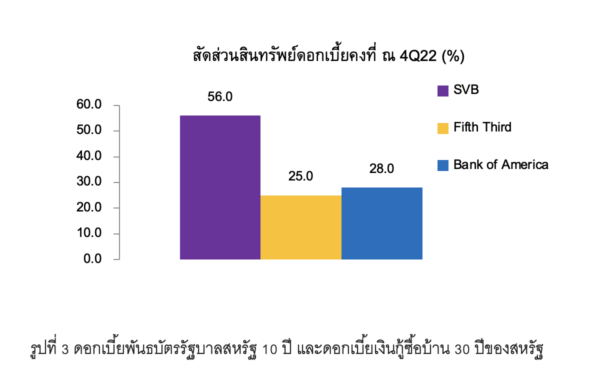 รูปที่ 2 สัดส่วนการถือสินทรัพย์ดอกเบี้ยคงที่ (รวมถึงพันธบัตรรัฐบาล) ของธนาคาร SVB เทียบกับธนาคารอื่นๆ