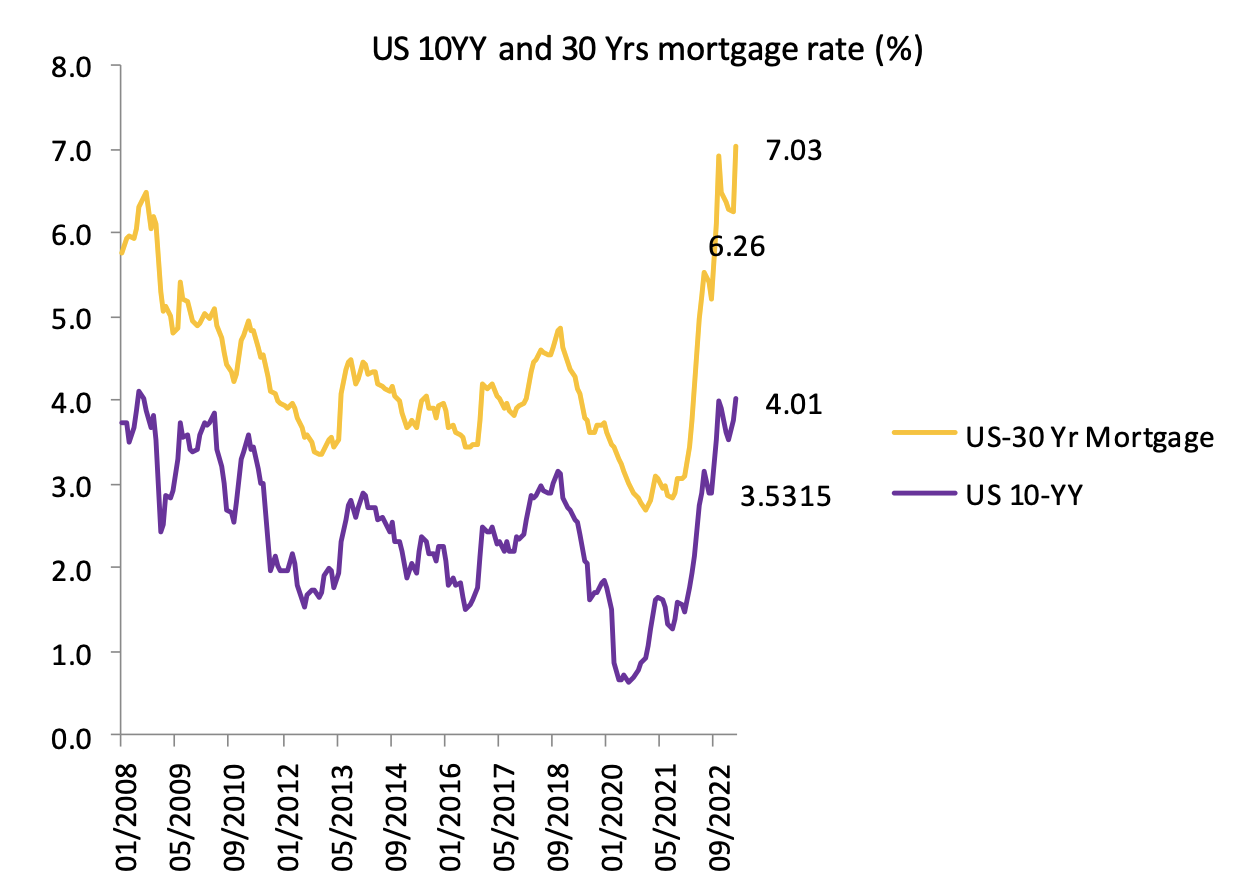 รูปที่ 3 ดอกเบี้ยพันธบัตรรัฐบาลสหรัฐฯ 10 ปี และดอกเบี้ยเงินกู้ซื้อบ้าน 30 ปีของสหรัฐฯ