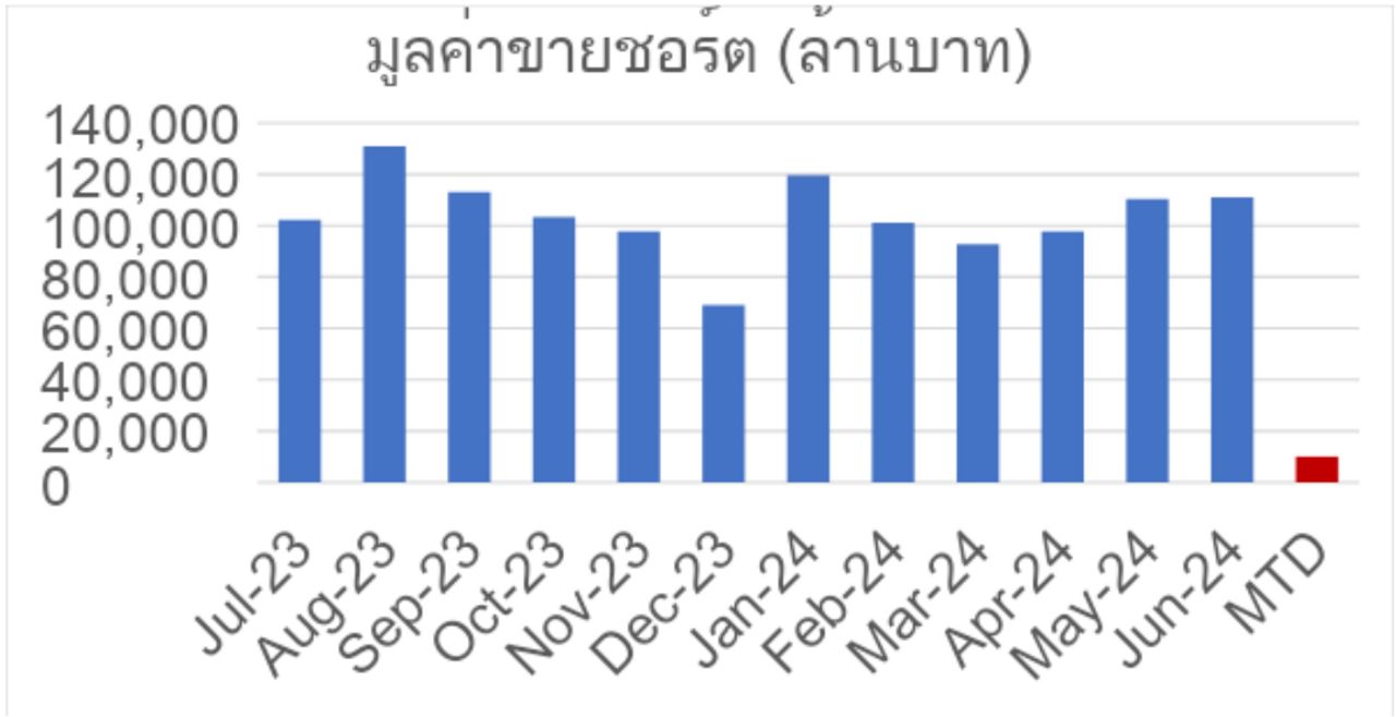 โดยพบว่ามูลค่าการขายชอร์ตในธุรกรรม SBL ลดลงอย่างมีนัยสำคัญ โดยในช่วง 7 วันทำการแรกของเดือน ก.ค. 67 ลดเหลือ 10,021 ล้านบาท เมื่อเทียบกับช่วงเดียวกันของเดือน มิ.ย. 67 ที่ 43,672 ล้านบาท ลดลงถึง 77% และคิดเป็นเพียง 9% ของมูลค่าทั้งเดือน มิ.ย. 67