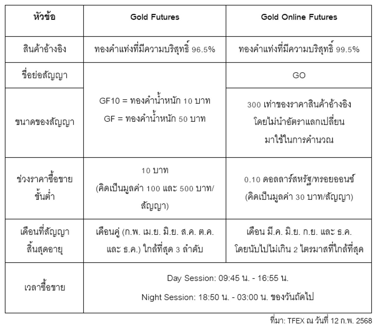 ช่องทางที่ 1 ซื้อขายเก็งกำไรผ่าน TFEX ได้ ซึ่งจะมีสินค้าให้เลือกคือ Gold Futures ที่ราคาอ้างอิงกับราคาทองในประเทศไทยและ Gold Online Futures ราคาอิงสกุลเงินดอลลาร์สหรัฐต่อทรอยออนซ์เหมือนราคาทองในตลาดโลก (ไม่มีความเสี่ยงเรื่องอัตราแลกเปลี่ยน) ซึ่งการซื้อขายผ่าน Futures จะมีข้อดีตรงที่วางเงินหลักประกันเพียง 4-5% ของมูลค่าสัญญา และซื้อขายได้ถึงตี 3 ของวันถัดไป