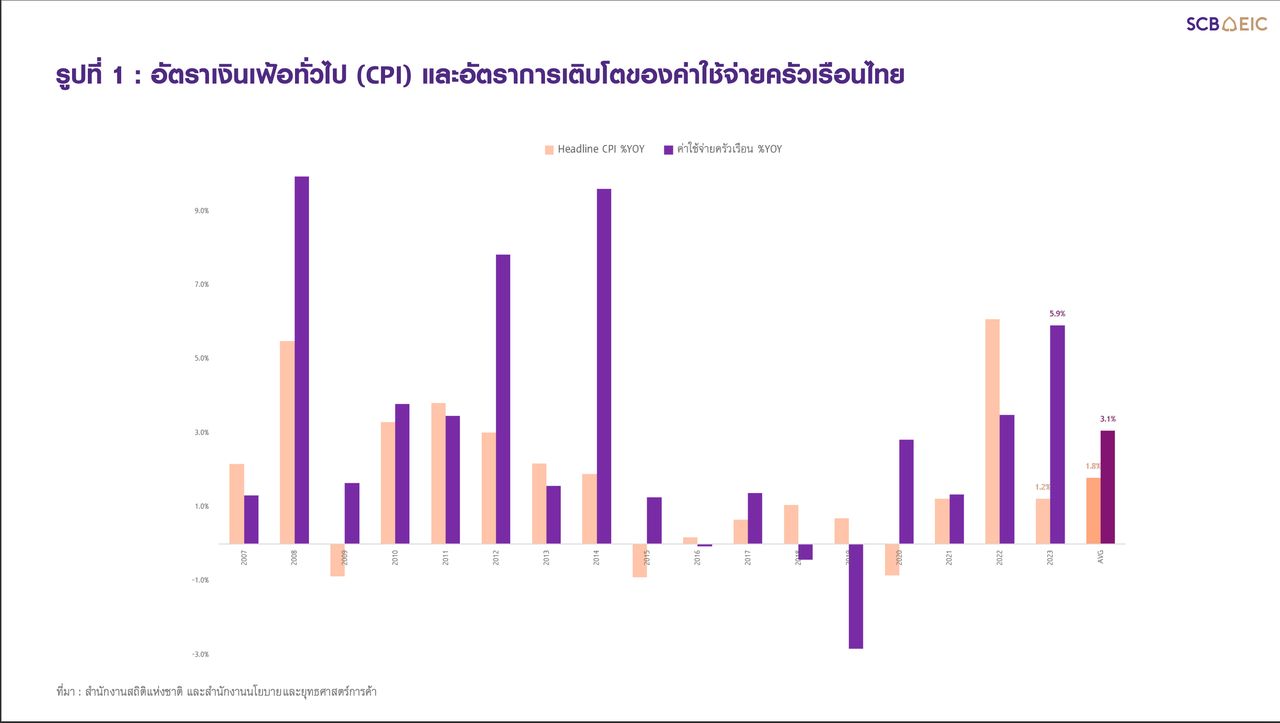 ในช่วงเกือบ 2 ทศวรรษที่ผ่านมาค่าใช้จ่ายครัวเรือนไทยมักจะเติบโตสูงกว่าอัตราเงินเฟ้อ อย่างไรก็ตาม ข้อมูลทั้งสองตัวนี้มีความสัมพันธ์กันอยู่ เช่นในปีที่อัตราเงินเฟ้อเป็นบวก ค่าใช้จ่ายก็มักจะโตขึ้นเช่นกัน โดยค่าใช้จ่ายครัวเรือนโตเฉลี่ยถึง 3.1% แต่อัตราเงินเฟ้อเฉลี่ยเพียง 1.8%