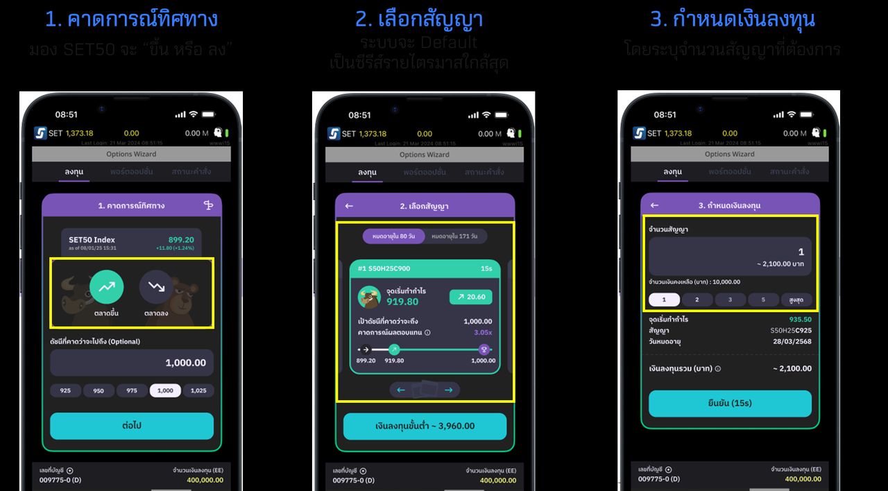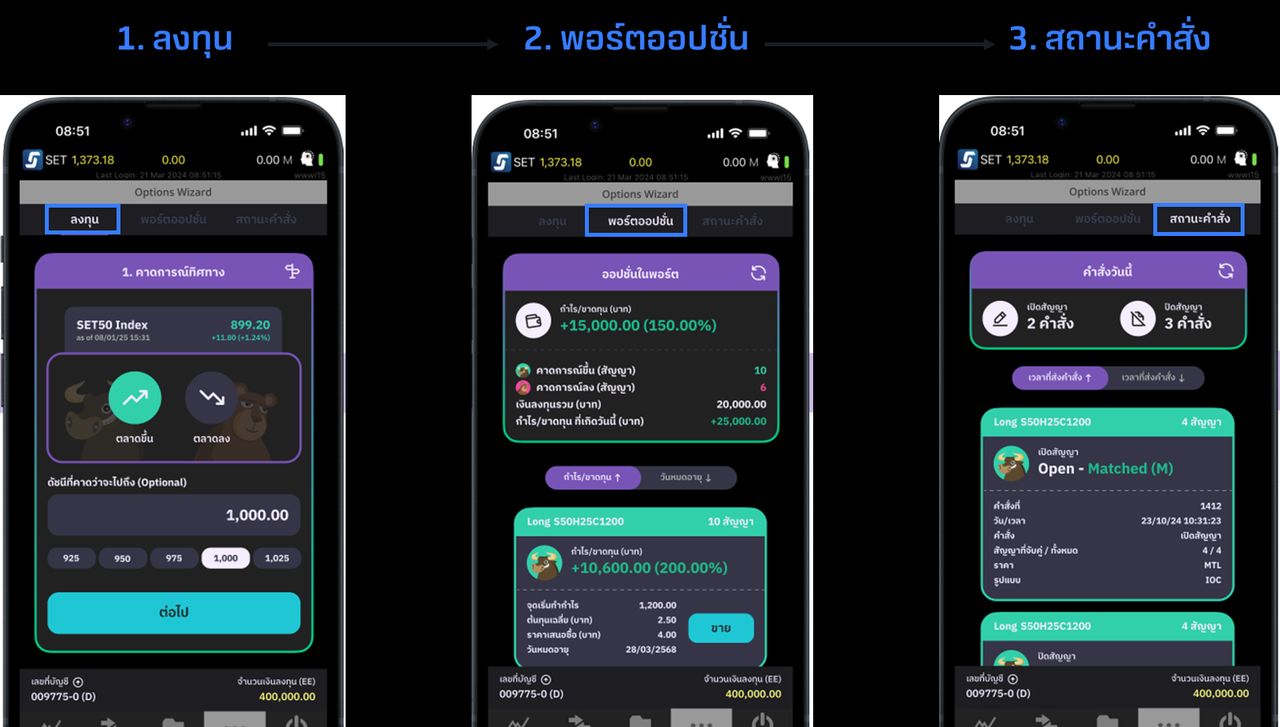 1. ลงทุน 2. พอร์ตออปชั่น 3. สถานะคำสั่ง ดังแสดงในภาพ