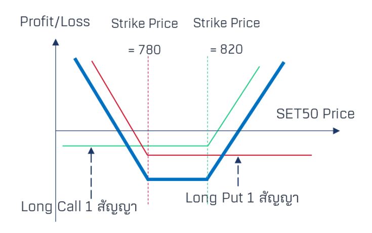 สามารถสร้างกลยุทธ์ได้โดยเปิด Long Call Options + Long Put Options ที่ราคาใช้สิทธิที่มีสถานะ Out of The Money กลยุทธ์นี้เรามองว่า SET50 Index จะผันผวนสูงกว่ากลยุทธ์ Straddle และไม่ทราบทิศทางเช่นเดียวกัน โดยมีภาพแสดงกำไร/ขาดทุนของกลยุทธ์ Long Strangle ดังนี้
