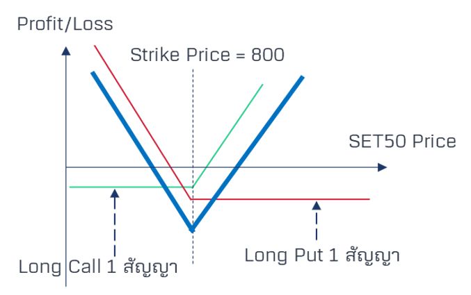 สามารถสร้างกลยุทธ์ได้โดยเปิด Long Call Options + Long Put Options โดยเน้นที่ราคาใช้สิทธิที่มีสถานะ At The Money กลยุทธ์นี้เรามองว่า SET50 Index จะผันผวนสูงแกว่งตัวออกไปห่างจากราคาใช้สิทธิ แต่ไม่ทราบทิศทาง โดยมีภาพแสดงกำไร/ขาดทุนของกลยุทธ์ Long Straddle ดังนี้
