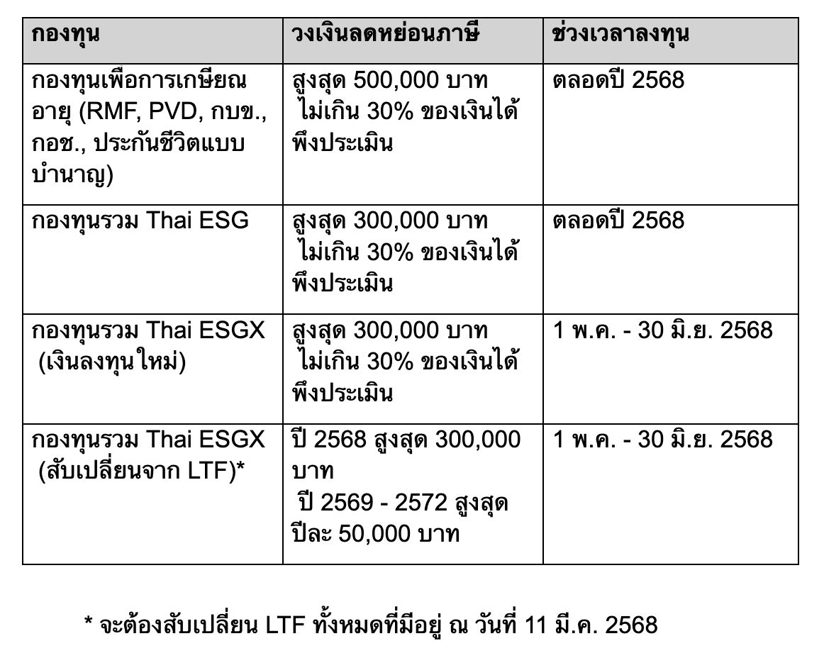 4. กองทุนรวม Thai ESGX (สับเปลี่ยนจาก LTF เดิมที่ครบกำหนดอายุแล้ว) สูงสุด 300,000 บาท (ต้องลงทุนในช่วง 1 พ.ค. - 30 มิ.ย. 2568 ที่ผ่านมา)