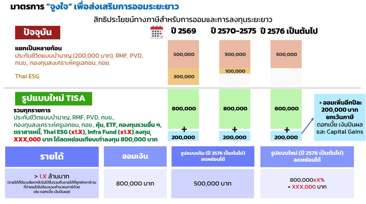 สำหรับบัญชีเงินออม TISA (Thailand Individual Savings Account) ที่รัฐบาลผลักดันให้นักลงทุนสามารถซื้อหุ้นไทยรายตัวได้โดยตรง เพื่อส่งเสริมการออมระยะยาวที่สามารถนำเงินลงทุนในหุ้นผ่านบัญชี TISA มาลดหย่อนภาษีได้โดยตรงตามจริง โดยไม่ต้องผ่านกองทุนรวมอย่าง RMF หรือ SSF แบบเดิมๆ โดยหุ้นที่ออมใน TISA สามารถนำมาลดหย่อนได้ตามจริง ไม่เกิน 800,000 บาท ซึ่งเป็นวงเงินเดียวกับการลงทุนอย่างอื่นที่ลดหย่อนได้ เช่น กองทุนสำรองเลี้ยงชีพ, กบข., ประกันบำนาญ, RMF, ThaiESG (ซึ่งเป็นวงเงินที่รวมกับกองทุนลดหย่อนภาษีอื่นๆ ในข้อที่ 1 และข้อ 2)
