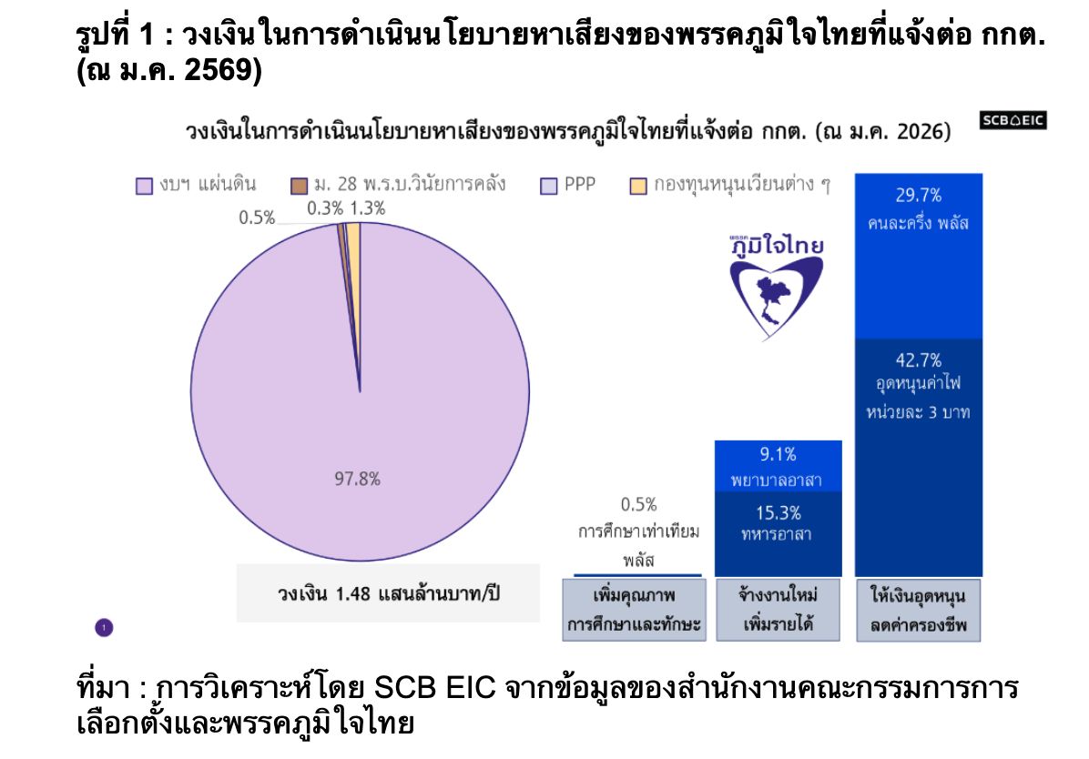 4.เมื่อพิจารณาในมิติของการแก้ปัญหาเชิงโครงสร้างระยะยาวสำหรับ 8 นโยบายที่พรรคภูมิใจไทยแจ้งต่อ กกต. พบว่า โครงสร้างการใช้วงเงินดำเนินนโยบายยังคงให้น้ำหนักกับการกระตุ้นอุปสงค์ในระยะสั้นมากกว่าการยกระดับศักยภาพการผลิตของประเทศและแก้ปัญหาเชิงโครงสร้างในระยะยาว งบประมาณส่วนใหญ่ 73% ถูกใช้ไปกับมาตรการให้เงินอุดหนุนและลดค่าครองชีพ เช่น โครงการคนละครึ่งพลัส และเงินอุดหนุนค่าไฟฟ้า เพื่อกระตุ้นการบริโภคและเสริมสร้างความเชื่อมั่นทางเศรษฐกิจในระยะสั้น ขณะที่อีก 25% เป็นมาตรการจ้างงาน สร้างรายได้ในระยะปานกลาง โดยเฉพาะกลุ่มอาชีพทหารและพยาบาล ในทางตรงกันข้าม นโยบายที่มีศักยภาพในการสร้างการเติบโตระยะยาว ไม่ว่าจะเป็นการลงทุนด้านการศึกษา การพัฒนาทักษะแรงงาน และการยกระดับทุนมนุษย์ภายใต้นโยบายการศึกษาเท่าเทียมพลัส กลับได้รับการจัดสรรวงเงินเพียง 0.5% ของวงเงินรวมเท่านั้น