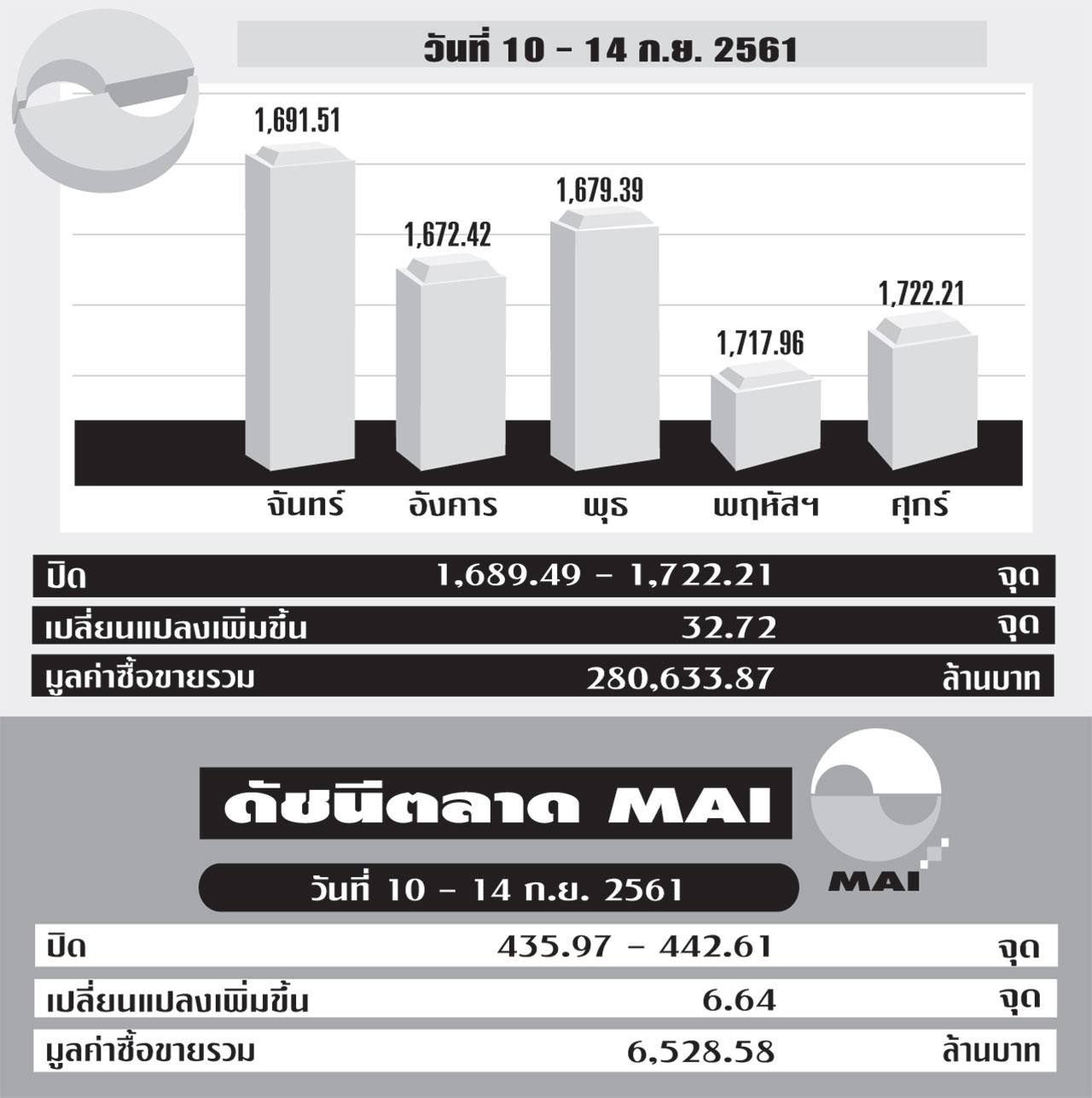 สัปดาห์ที่ผ่านมาดัชนีตลาดหุ้นไทยฟื้นตัวขึ้นอย่างแข็งแกร่ง โดยดัชนี SET ปิดที่ระดับที่ 1,722.21 จุด เพิ่มขึ้น 1.94% จากสัปดาห์ก่อน ขณะที่มูลค่าการซื้อขายเฉลี่ยต่อวันเพิ่มขึ้น 20.63% จากสัปดาห์ก่อนมาที่ 56,126.77 ล้านบาท ส่วนตลาดหลักทรัพย์ mai ปิดที่ 442.61 จุด เพิ่มขึ้น 1.52% จากสัปดาห์ก่อน