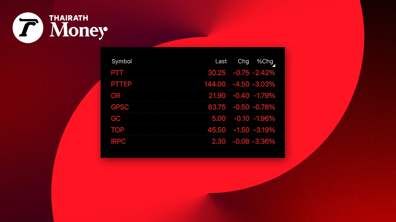 ความเคลื่อนไหวของราคาหุ้นกลุ่ม ปตท. ในช่วงเปิดตลาดการซื้อขายเช้าวันนี้ (3 พ.ค. 66) ปรับตัวลดลงแรง นำโดยหุ้นของ บมจ. ปตท. (PTT) ปรับตัวลดลง 2.42% มาอยู่ที่ 30.25 บาท, บมจ. ปตท. สำรวจและผลิตปิโตรเลียม (PTTEP) ปรับตัวลดลง 3.03% มาอยู่ที่ 144.00 บาท, บมจ. ปตท. น้ำมันและการค้าปลีก (OR) ปรับตัวลดลง 1.79% มาอยู่ที่ 21.90 บาท, บมจ. โกลบอล เพาเวอร์ ซินเนอร์ยี่ (GPSC) ปรับตัวลดลง 0.78% มาอยู่ที่ 63.75 บาท, บมจ. โกลบอล คอนเน็คชั่นส์ (GC) ปรับตัวลดลง 1.96% มาอยู่ที่ 5.00 บาท, บมจ. ไทยออยล์ (TOP) ปรับตัวลดลง 3.19% มาอยู่ที่ 45.50 บาท และ บมจ. ไออาร์พีซี (IRPC) ปรับตัวลดลง 3.36% มาอยู่ที่ 2.30 บาท