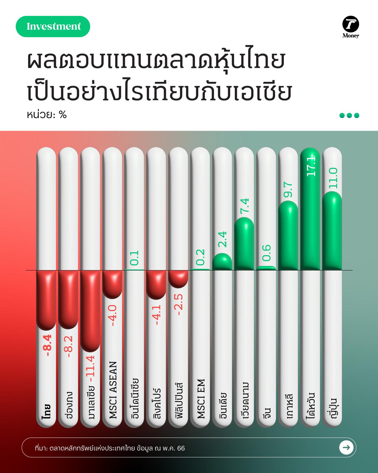 ข้อมูลจากตลาดหลักทรัพย์แห่งประเทศไทย ณ สิ้นเดือนพฤษภาคม 2566 SET Index ปิดที่ระดับ 1,533.54 จุด ปรับเพิ่มขึ้น 0.3% จากเดือนก่อนหน้า และปรับลดลง 8.1% จากต้นปี โดยปรับไปในทิศทางเดียวกับดัชนีตลาดหลักทรัพย์อื่นในอาเซียน