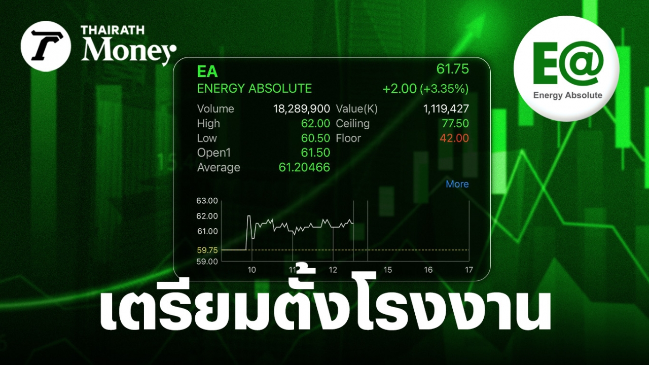 ความเคลื่อนไหวราคาหุ้นบริษัท พลังงานบริสุทธิ์ จำกัด (มหาชน) หรือ EA ช่วงการซื้อขายภาคเช้าวันนี้เพิ่มขึ้น 2.00 บาท หรือ +3.35% มาอยู่ที่ 61.75 บาทต่อหุ้น หลังแจ้งข่าวการลงนามบันทึกความเข้าใจเพื่อศึกษาการจัดตั้งโรงงานผลิตเซลล์แบตเตอรี่กำลังการผลิตเริ่มต้นที่ 6 กิกะวัตต์ชั่วโมงต่อปีในประเทศไทย ร่วมกับ 2 พันธมิตรรายใหญ่จากจีน