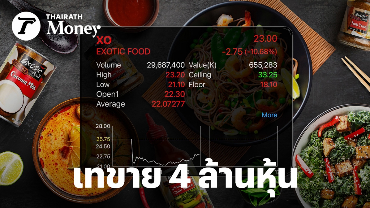 ความเคลื่อนไหวราคาหุ้น บริษัท เอ็กโซติค ฟู้ด จำกัด (มหาชน) หรือหุ้น XO ในการซื้อขายช่วงเช้าวันนี้ (26 ธ.ค.) ปรับตัวลดลงมาอยู่ที่ 23.00 บาท เมื่อเทียบกับวันที่ 21 ธันวาคม 2566 ที่ราคาเปิดตลาดอยู่ที่ 27.75 บาท โดยลดลง 4.75 บาท หรือ -17.11% ระหว่างวันพบรายการขายหุ้นของผู้บริหารและผู้ถือหุ้นใหญ่ จำนวน 4,000,000 หุ้น ที่ราคาซื้อขายเฉลี่ย 26.91 บาทต่อหุ้น คิดเป็นมูลค่ากว่า 107.64 ล้านบาท