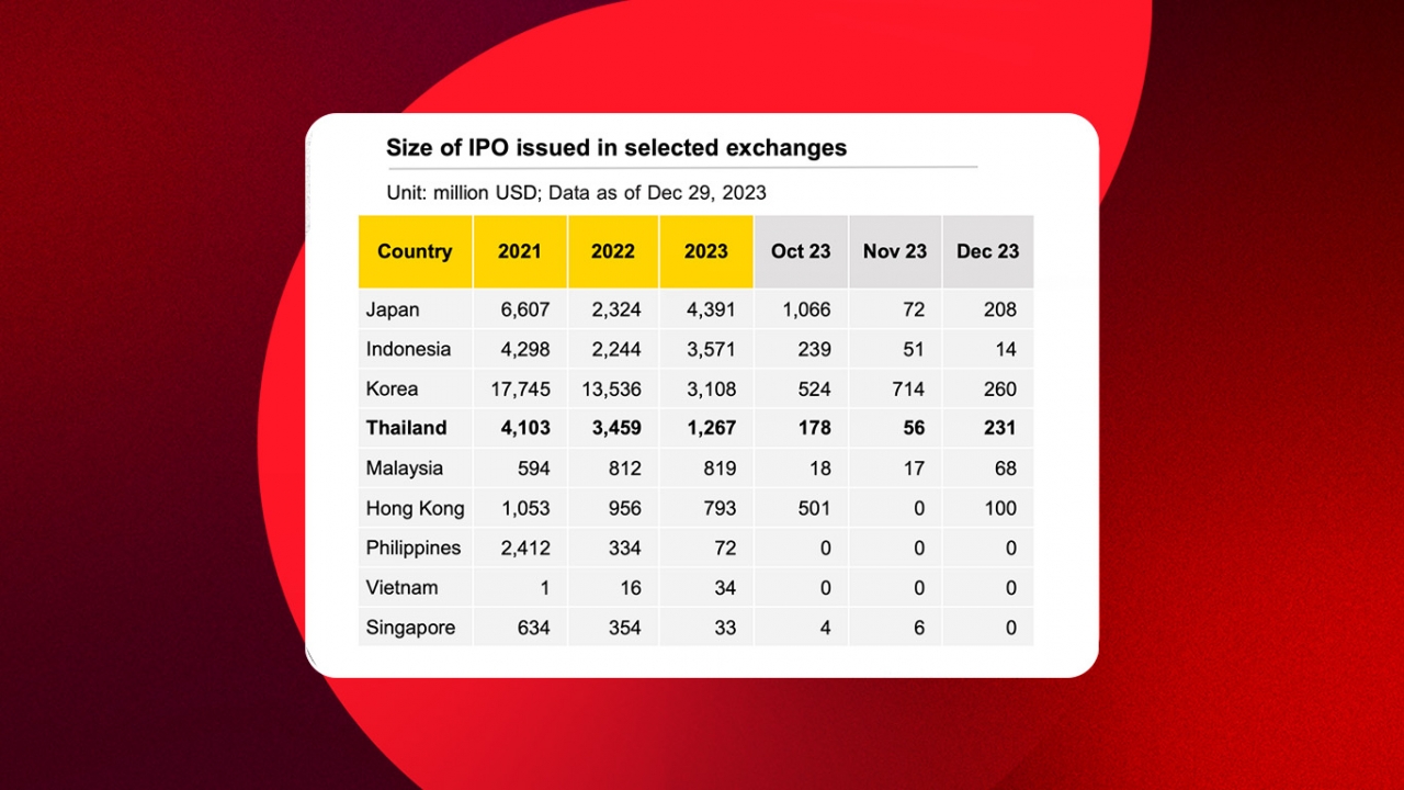 ดร.ศรพล ตุลยะเสถียร รองผู้จัดการ หัวหน้าสายงานวางแผนกลยุทธ์องค์กร ตลาดหลักทรัพย์แห่งประเทศไทย เปิดเผยกับ Thairath Money ว่า การระดมทุนในตลาดหุ้นไทยในปีนี้มีการระดมทุนเป็นอันดับที่ 2 ของอาเซียน ซึ่งเหตุผลหลักมาจากการเลื่อนเข้าไอพีโอของบริษัทขนาดใหญ่ที่เดิมทีคาดว่าจะเข้าระดมทุนในปี 2566 แต่มีการเลื่อนที่จะเข้าระดมทุนในปี 2567 เป็นการทดแทน