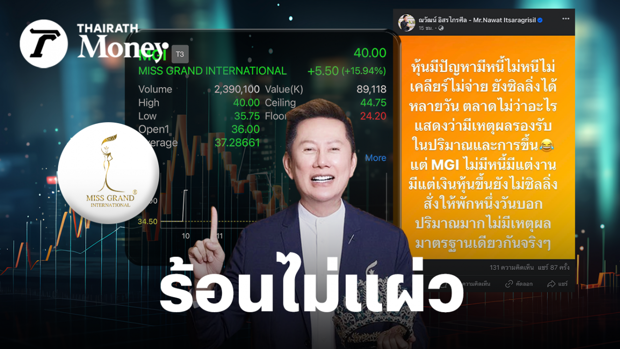 ด้าน ณวัฒน์ อิสรไกรศีล ประธานเจ้าหน้าที่บริหาร บมจ.มิสแกรนด์ อินเตอร์เนชั่นแนล (MGI) เคลื่อนไหวบนเฟซบุ๊กส่วนตัว แสดงความเห็นถึงการหยุดพักการซื้อขายว่า “หุ้นมีปัญหามีหนี้ไม่หนีไม่เคลียร์ไม่จ่าย ยังซิลลิ่งได้หลายวัน ตลาดไม่ว่าอะไร แสดงว่ามีเหตุผลรองรับในปริมาณและการขึ้น แต่ MGI ไม่มีหนี้มีแต่งาน มีแต่เงิน หุ้นขึ้นยังไม่ซิลลิ่งสั่งให้พักหนึ่งวันบอกปริมาณมากไม่มีเหตุผล มาตรฐานเดียวกันจริงๆ”