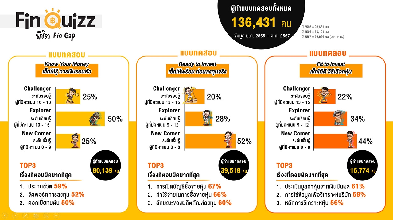 โดยในแบบทดสอบมี 3 เรื่องหลัก คือ 1.ความรู้การเงินในชีวิตประจำวัน (Know Your Money) 2.ความรู้การลงทุนในหลักทรัพย์ (Ready to Invest) และ 3.ความรู้การเลือกหุ้น (Fit to Invest) และนับตั้งแต่เดือน ม.ค. 2565 ถึง ต.ค. 2567 มีผู้ทำแบบทดสอบประเมินระดับความรู้ บนเว็บไซต์ SET Fin Quizz จำนวน 136,431 คน