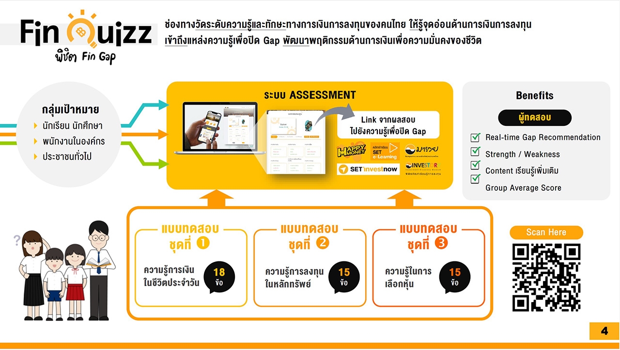 โดย SET Fin Quizz มีแบบทดสอบและประเมินผลระดับความรู้ทางการเงินของคนไทย เพื่อนำมาใช้เป็นตัวชี้วัด ในการนำเสนอความรู้จากแหล่งเรียนรู้ ที่สอดคล้องกับผลประเมินของผู้ทำแบบทดสอบ สามารถเป็นแนวทางในการพัฒนาความรู้และส่งเสริมพฤติกรรมที่ดีในด้านการเงินโดยรวมของคนไทย