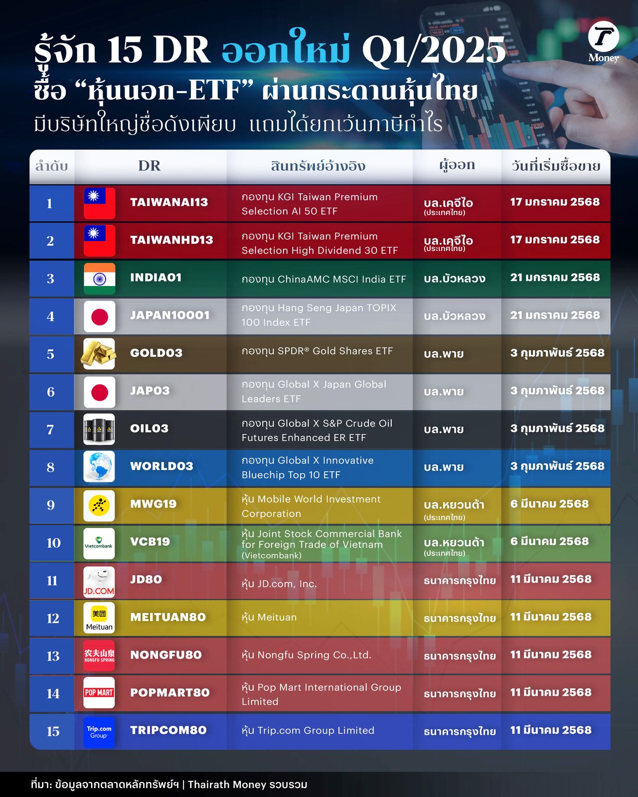 นับตั้งแต่ต้นปี 2568 มีการออก DR ใหม่ จำนวน 15 หลักทรัพย์ ครอบคลุมสินทรัพย์หลากหลายประเภท ตั้งแต่หุ้นเทคโนโลยี หุ้นธนาคาร กองทุนน้ำมัน กองทุนทองคำ ไปจนถึงตลาดเกิดใหม่อย่างเวียดนามและอินเดีย ซึ่งมีรายละเอียดแต่ละหลักทรัพย์ ดังนี้
