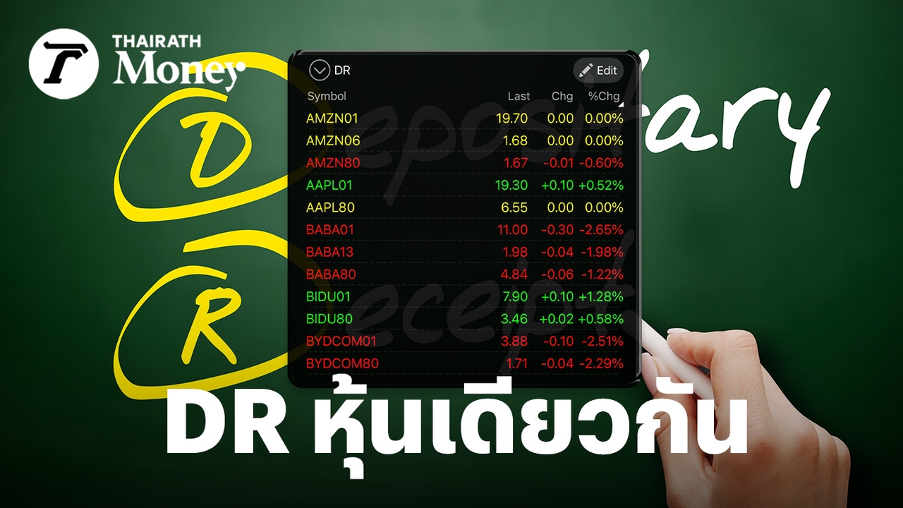 Thairath Money จะพามาทำความเข้าใจกับ DR หรือ Depositary Receipt ตราสารที่เปิดประตูสู่การลงทุนในหลักทรัพย์ต่างประเทศได้อย่างสะดวกสบาย ผ่านตลาดหุ้นไทย พร้อมไขข้อสงสัยที่หลายคนอยากรู้ว่า DR ที่อ้างอิงหุ้นเดียวกัน ทำไมถึงมีหลายตัว แล้วเลขข้างหลังคืออะไร รวมถึงทำไมราคาถึงแตกต่างกัน