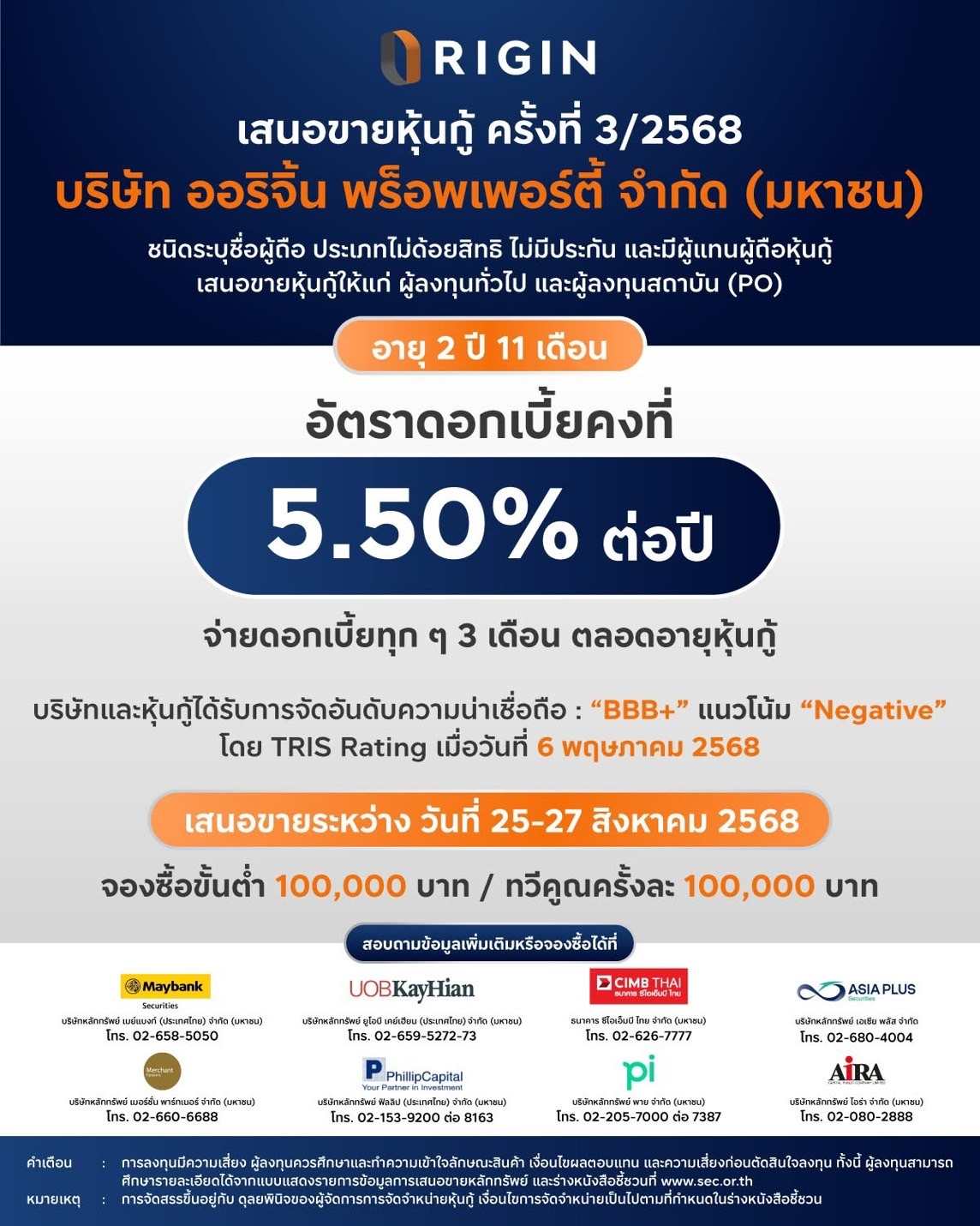 ทั้งนี้ ตลอดปี 2568 ที่ผ่านมานี้ ออริจิ้น พร็อพเพอร์ตี้ ได้มีการเสนอขายหุ้นกู้ต่อผู้ลงทุนทั่วไปมาแล้ว 2 ครั้ง ในช่วงเดือนกุมภาพันธ์ และเมษายนที่ผ่านมา