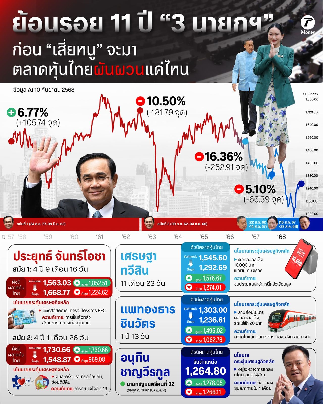 ตลอดทศวรรษที่ผ่านมา ตลาดหุ้นไทยเผชิญกับความผันผวนอย่างรุนแรง สะท้อนภาพความท้าทายทางเศรษฐกิจและการเมือง ภายใต้การบริหารงานของนายกรัฐมนตรีแต่ละสมัย ซึ่งเป็นผลมาจากปัจจัยท้าทายที่แตกต่างกัน