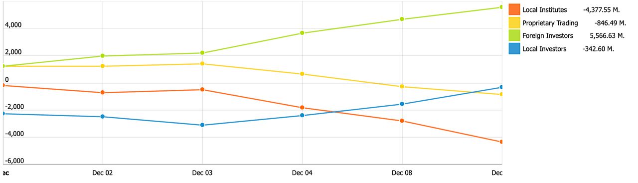 หากไปดูข้อมูลตลาดหลักทรัพย์แห่งประเทศไทย พบว่าแรงซื้อของนักลงทุนต่างชาติยังคงเป็นประเด็นสำคัญที่ขับเคลื่อนตลาดหุ้นไทยในช่วงต้นเดือนธันวาคม 2568 หลังพบการซื้อสุทธิต่อเนื่องถึง 6 วันทำการ รวมมูลกว่า 5,566.63 ล้านบาท