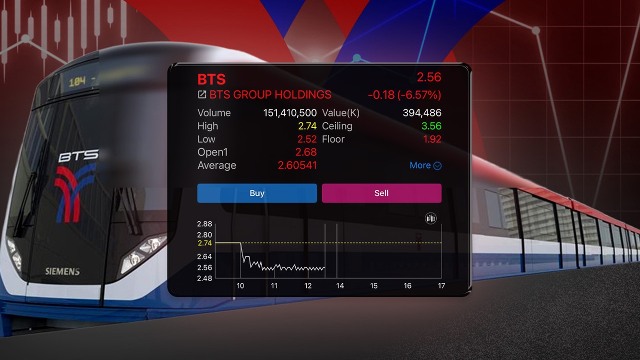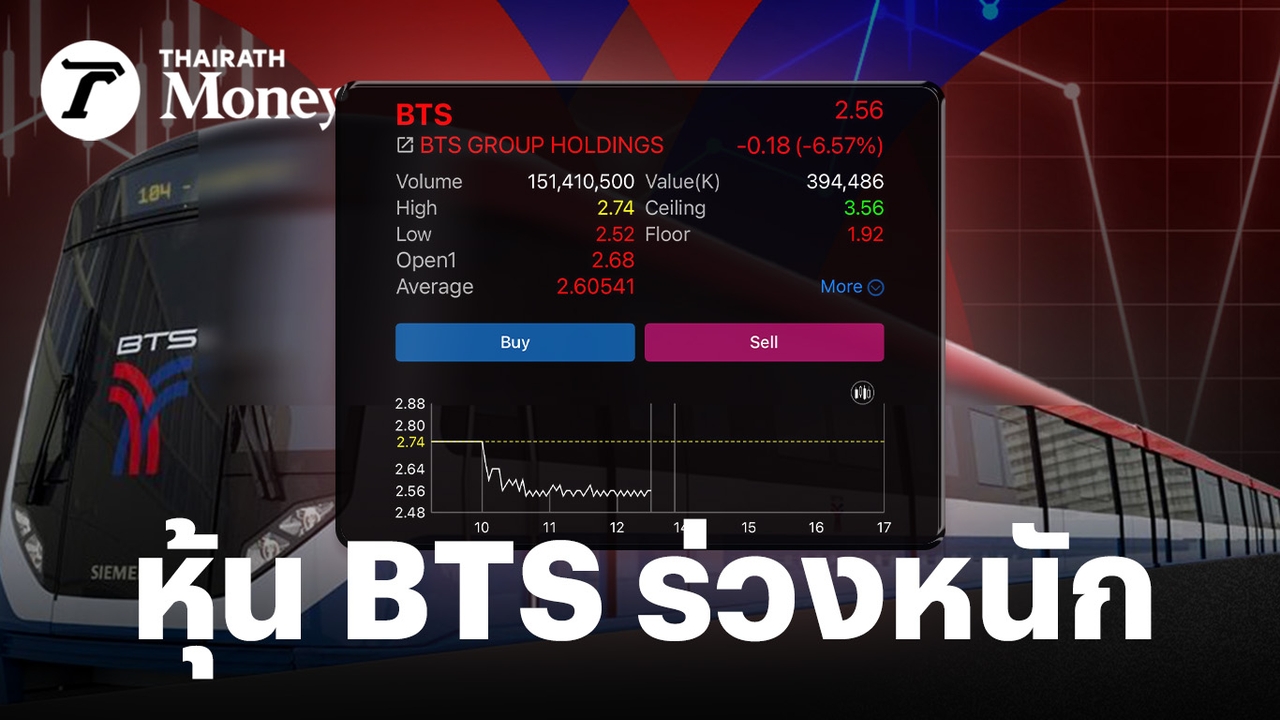 ราคาหุ้นของ บริษัท บีทีเอส กรุ๊ป โฮลดิ้งส์ จำกัด (มหาชน) หรือหุ้น BTS วันนี้ทรุดตัวลงอย่างหนัก ปิดตลาดช่วงเช้าเหลือเพียง 2.56 บาท ลดลง 0.18 บาท หรือ -6.57% จากราคาปิดวันก่อนหน้า