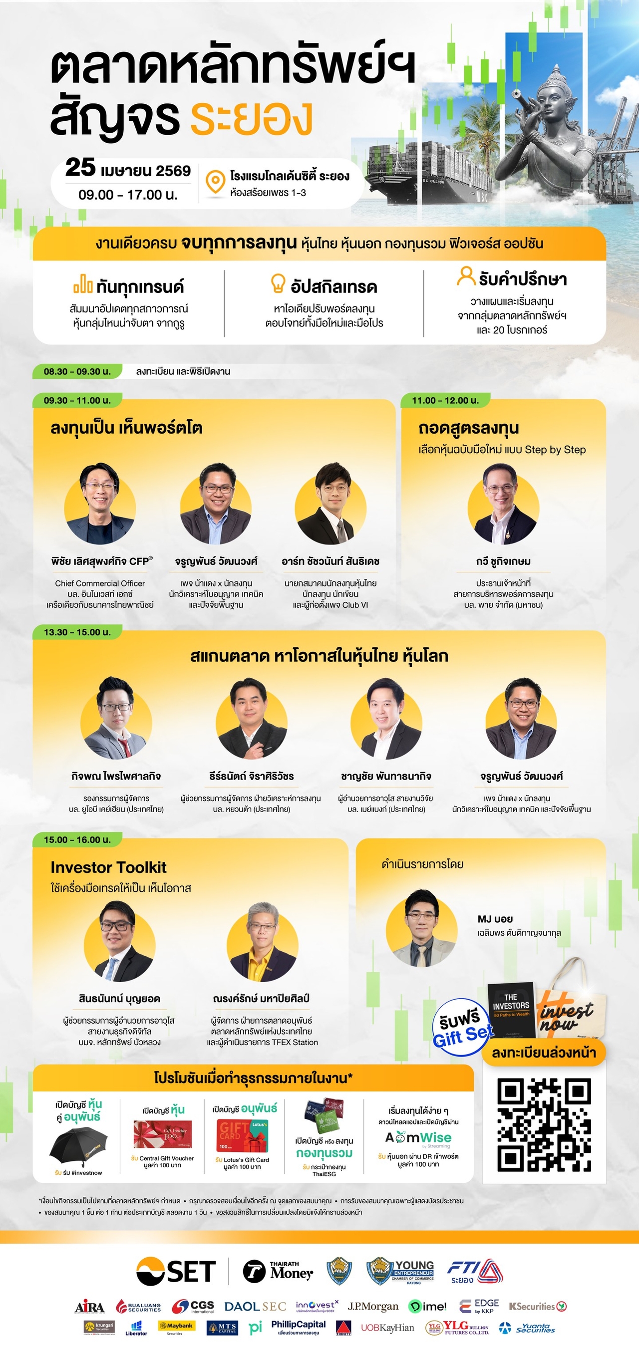 วิเคราะห์เจาะลึกทิศทางการลงทุนโดย 4 นักวิเคราะห์ จาก 3 บริษัทหลักทรัพย์ ได้แก่ กิจพณ ไพรไพศาลกิจ (บริษัทหลักทรัพย์.ยูโอบี เคย์เฮียน ประเทศไทย) ธีรเศรษฐ์ จิรวราไพศาล (บริษัทหลักทรัพย์ หยวนต้า) ชาญชัย พันธาทนากิจ (บริษัทหลักทรัพย์เมย์แบงก์) และจรูญพันธ์ วัฒนวงศ์ ที่จะมาบรรยายถึงโอกาสในการลงทุนเจาะทั้งในประเทศและต่างประเทศ