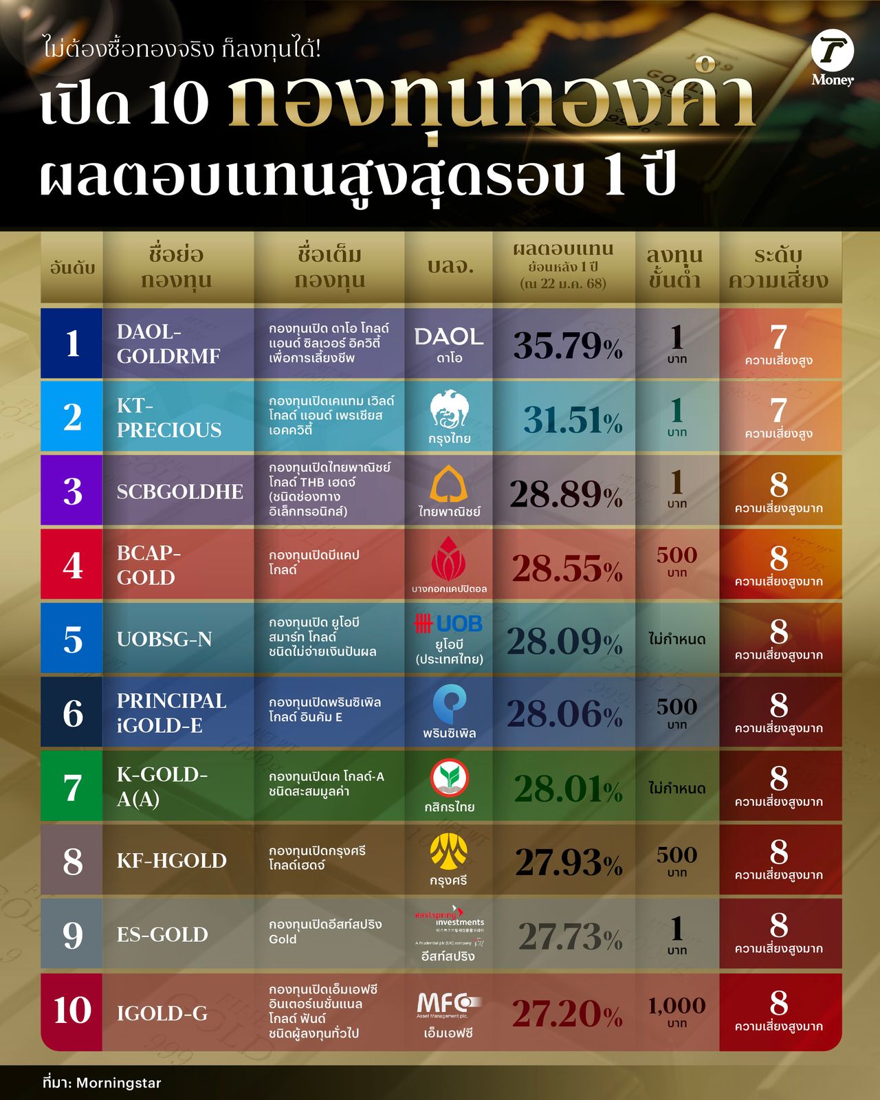 ในครั้งนี้ “Thairath Money” รวบรวมข้อมูล 10 กองทุนทองคำ จาก Morningstar ที่ให้ผลตอบแทนสูงสุดในรอบ 1 ปี (ข้อมูล ณ 22 ม.ค. 68) โดยยกมาเฉพาะประเภทของแต่ละกองทุนหลักที่ให้ผลตอบแทนสูงสุด เพื่อเป็นตัวเลือกที่อาจตอบโจทย์ด้านการลงทุนและโอกาสทำกำไร ดังนี้