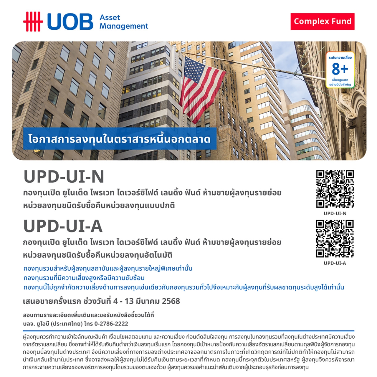 2. UPD-UI-A - กองทุนเปิด ยูไนเต็ด ไพรเวท ไดเวอร์ซิไฟด์ เลนดิ้ง ฟันด์ ห้ามขายผู้ลงทุนรายย่อย หน่วยลงทุนชนิดรับซื้อคืนหน่วยลงทุนแบบอัตโนมัติ https://www.uobam.co.th/th/mutual-fund/00854/UPD-UI-A