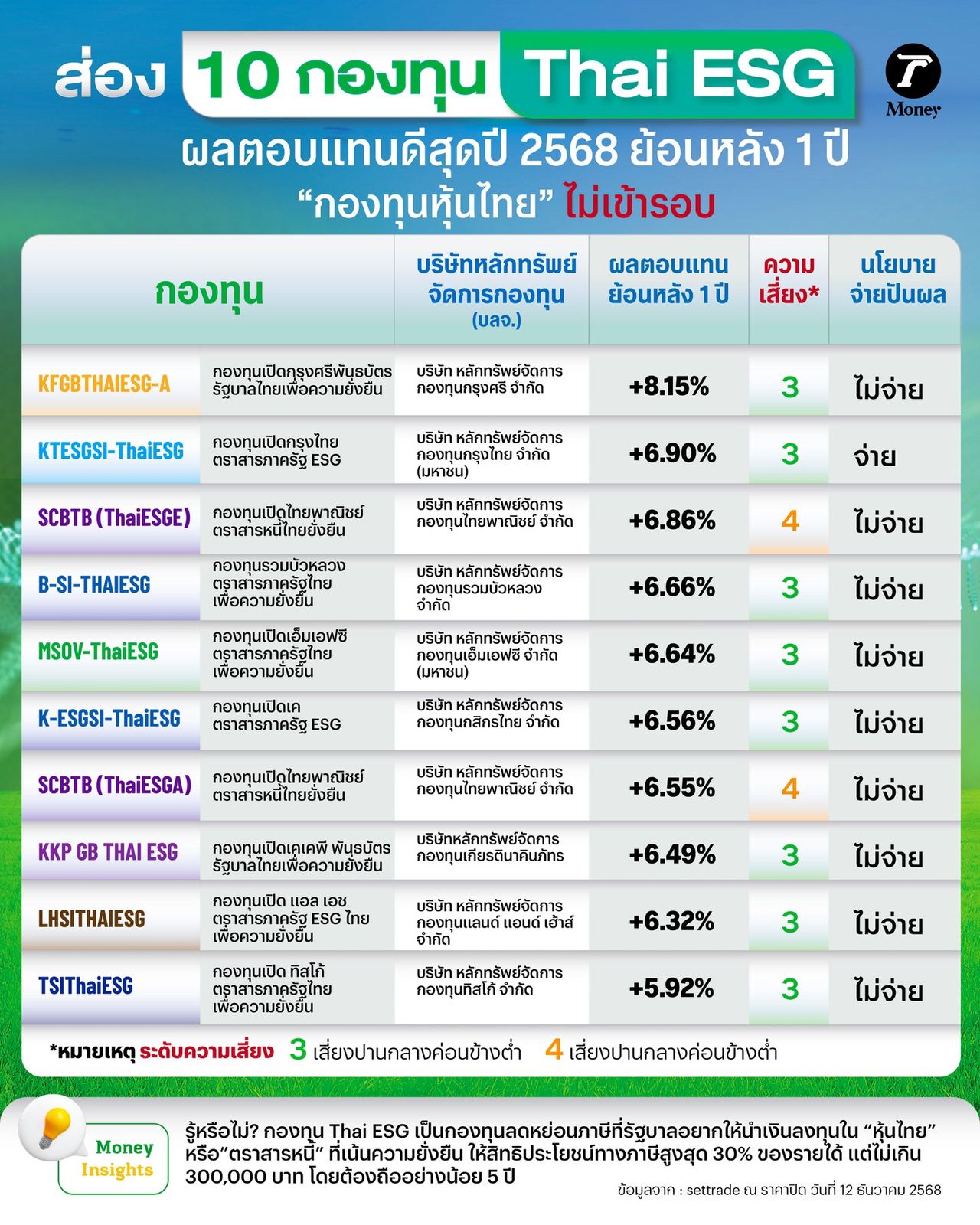 อย่างไรก็ตาม หากไปดูผลตอบแทนย้อนหลัง 1 ปี (ณ ราคาปิดวันที่ 12 ธ.ค.68) ที่ปรากฏชื่อ 10 อันดับแรกของกองทุน Thai ESG ที่ให้ผลตอบแทนดีที่สุด ดูเหมือนว่ากระแสเงินลงทุนจะไหลไปสู่ "กองทุนตราสารหนี้" มากกว่า "กองทุนหุ้น" อย่างชัดเจน