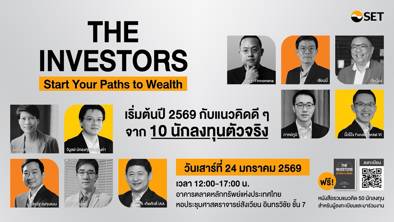 พิเศษ! เฉพาะงานนี้เท่านั้น นอกจากความรู้เน้นๆแล้ว ผู้ลงทะเบียนล่วงหน้าและมาร่วมงานจะได้รับหนังสือ “THE INVESTORS” ฟรี แถมยังได้ใกล้ชิดกับนักเขียนอีกด้วย สนใจลงทะเบียนได้แล้วที่นี่ https://www.set.or.th/th/about/event-calendar/event/eventdetails?id=88086