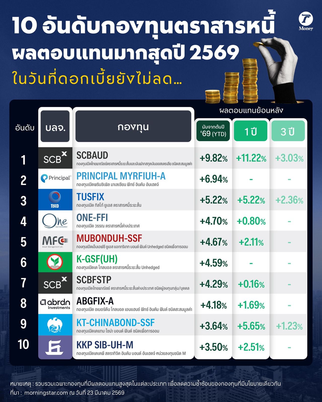 หมายเหตุ : รวบรวมเฉพาะกองทุนที่มีผลตอบแทนสูงสุดในแต่ละประเภท เพื่อลดความซ้ำซ้อนของกองทุนที่มีนโยบายเดียวกัน จาก morningstar.com ณ วันที่ 23 มี.ค. 2569