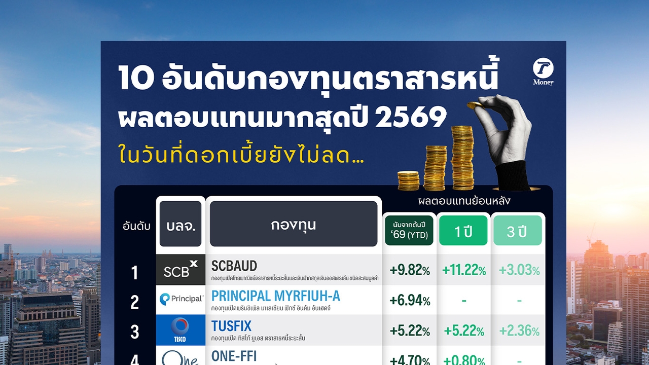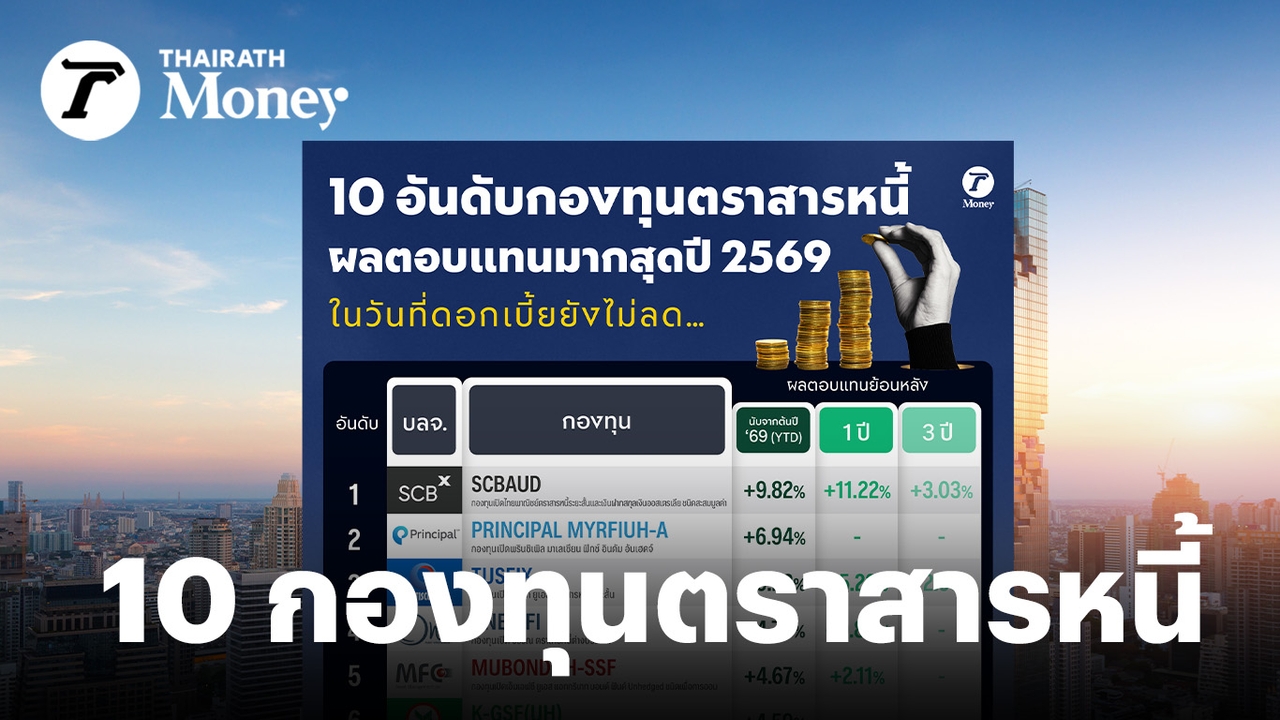 Thairath Money พาไปดู 10 อันดับกองทุนตราสารหนี้ที่ทำผลตอบแทนได้ดีที่สุดตั้งแต่ต้นปี 2569 นี้ ท่ามกลางสถานการณ์ที่ “ดอกเบี้ยไม่ลงง่าย”