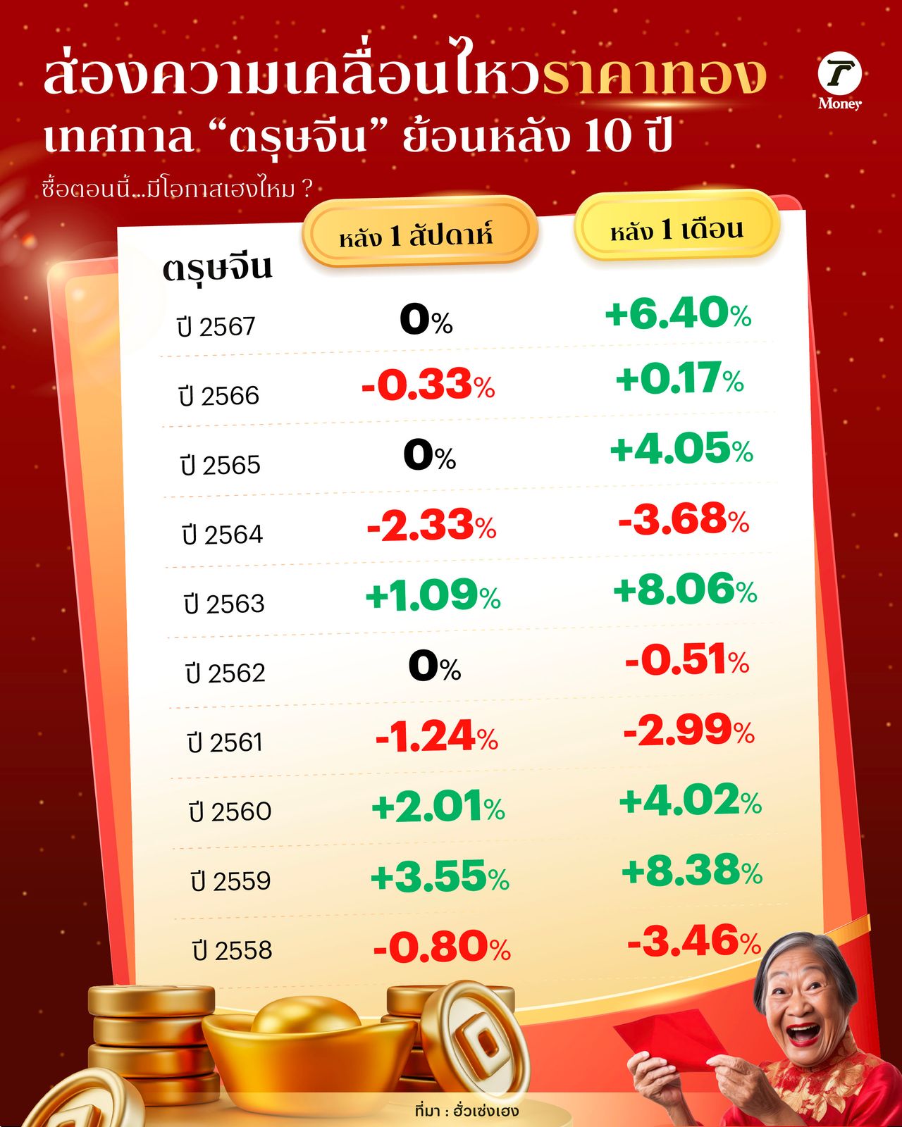 จากสถิติย้อนหลัง 10 ปี พบว่าราคาทองคำมีการปรับตัวเพิ่มขึ้นหลังเทศกาลตรุษจีน 1 เดือน จำนวน 6 ปี จาก 10 ปีที่ผ่านมา สะท้อนให้เห็นว่าช่วงเวลานี้อาจเป็นจังหวะที่ดีสำหรับการลงทุนทองคำ โดยข้อมูลจาก "ฮั่วเซ่งเฮง" แสดงให้เห็นว่า ราคาทองคำหลังตรุษจีนในระยะ 1 เดือน มีการปรับตัวเพิ่มขึ้นเฉลี่ยในหลายปี อย่างล่าสุดปี 2567 เพิ่มขึ้นถึง 6.40% และปี 2559 ที่เพิ่มขึ้นสูงสุด 8.38%