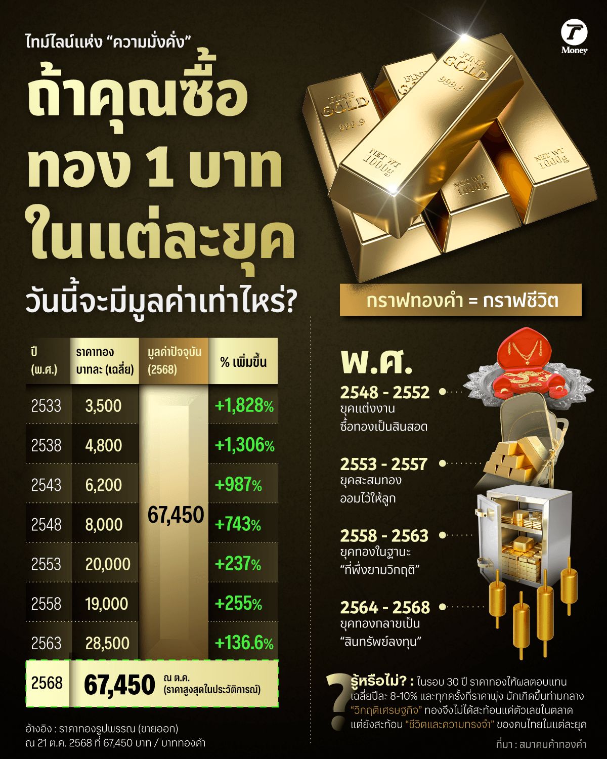 ย้อนไทม์ไลน์ ดูตั้งแต่ปี 2533 ที่ราคาทองเพียง 3,500 บาทต่อบาททองคำ หากเก็บไว้จนถึงปัจจุบัน (21 ตุลาคม 2568) ทองคำเส้นนั้น จะมีมูลค่าถึง 67,450 บาท เพิ่มขึ้นกว่า 1,828% ตัวเลขนี้ไม่ได้สะท้อนแค่ผลตอบแทนจากการลงทุน แต่คือเรื่องราวของเศรษฐกิจที่ผันผ่านทั้งวิกฤติฟื้นตัว และความมั่งคั่งที่คนไทยเฝ้ามองมาเกิน 30 ปี