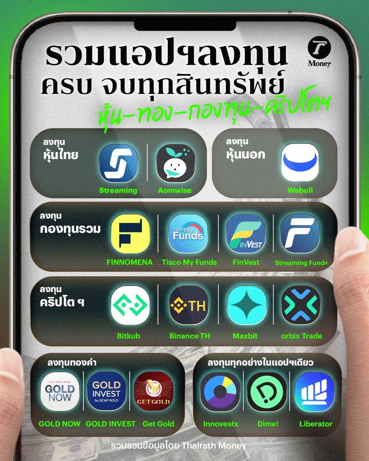 ไม่ว่าจะเป็นการลงทุนในหุ้นไทย หุ้นต่างชาติ กองทุนรวม คริปโต ฯ และการลงทุนทองคำ สามารถดำเนินการผ่านแอปพลิเคชันที่ออกแบบมาเพื่อความสะดวกของผู้ใช้ ไม่ว่าจะเป็นนักลงทุนมือใหม่ที่เพิ่งเริ่มต้น หรือมืออาชีพที่มีประสบการณ์ก็จะสามารถลงทุนได้ง่ายและทำได้ทุกที่ ทุกเวลา ซึ่ง Thairath Money ได้มัดรวมตัวช่วยสุดสะดวกมาดังนี้