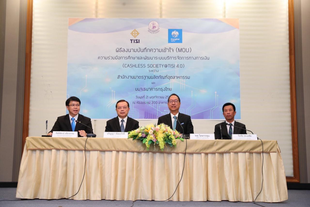 เมื่อวันที่ 21 พฤศจิกายน 2561 นายพสุ โลหารชุน ปลัดกระทรวงอุตสาหกรรม และนายปริญญา พัฒนภักดี รองกรรมการผู้จัดการใหญ่อาวุโส ธนาคารกรุงไทย เป็นประธานในพิธีลงนามความร่วมมือระหว่าง นายกิตติพัฒน์ เพียรธรรม ผู้ช่วยกรรมการผู้จัดการใหญ่อาวุโส ธนาคารกรุงไทย และนายวันชัย พนมชัย รองเลขาธิการ รักษาราชการแทนเลขาธิการสำนักงานมาตรฐานผลิตภัณฑ์อุตสาหกรรม (สมอ.) ในโครงการ Cashless Society @ TISI 4.0