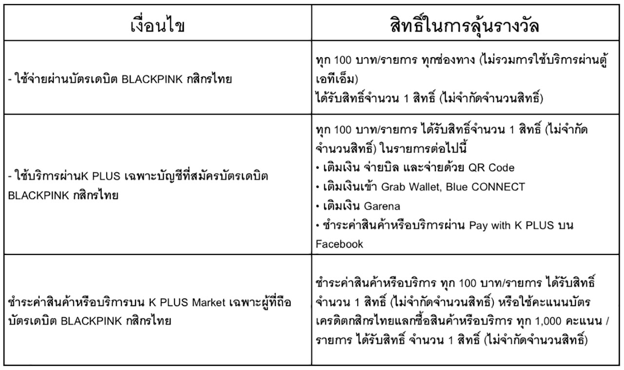 ลูกค้าบัตรเดบิต KBank x BLACKPINK ทุกคนมีสิทธิ์ร่วมลุ้นจับรางวัลบัตร KBank x BLACKPINK FAN MEETING จำนวน 2,500 ที่นั่ง มูลค่ารวม 7.5 ล้านบาท พิเศษ! สำหรับลูกค้าที่มีสิทธิ์รวมสูงสุดผ่านช่องทางที่ธนาคารกำหนด 100 ท่านแรก รับทันทีบัตร KBank x BLACKPINK FAN MEETING 1 คน/1 ใบ รวมทั้งสิ้น 100 รางวัล โดยลูกค้าที่สนใจสามารถเข้าร่วมกิจกรรมได้ง่ายๆ ตามเงื่อนไขต่อไปนี้