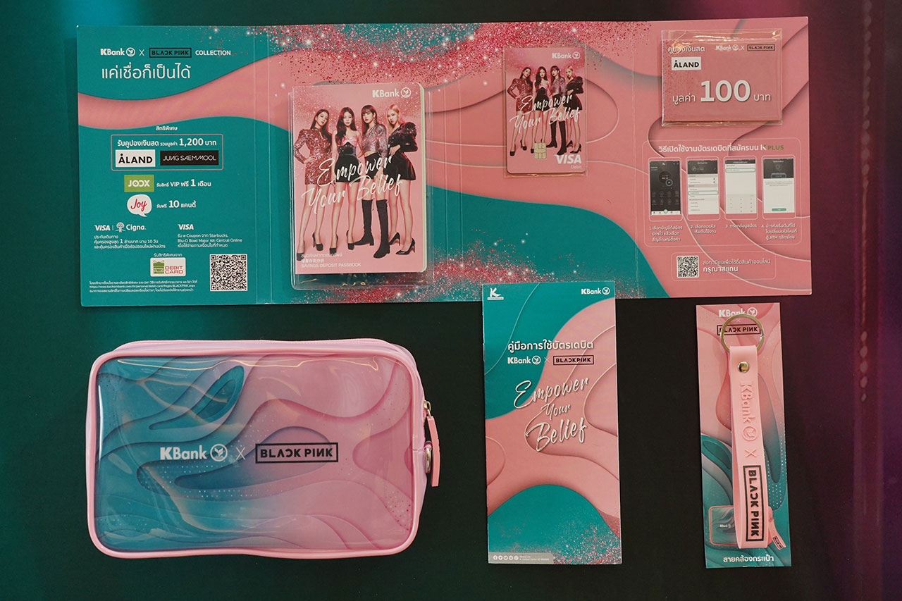 เซตบัตรเดบิต KBank x BLACKPINK ประกอบด้วยบัตรเดบิตกับสมุดบัญชีออมทรัพย์ ซึ่งมีให้เลือก 5 ลาย ได้แก่ บัตรรวมวง, บัตร Jennie, บัตร Rosé, บัตร Lisa, บัตร Jisoo / และ Code เพื่อดาวน์โหลดธีม K PLUS โดยทั้งหมดบรรจุอยู่ในกระเป๋า KBank x BLACKPINK (ลายบัตรเดบิตกับสมุดบัญชีออมทรัพย์ ไม่สามารถเลือกคละลายได้, ช่องทางสมัครผ่าน K PLUS และสาขา จะได้รับชุดผลิตภัณฑ์ที่แตกต่างกัน)