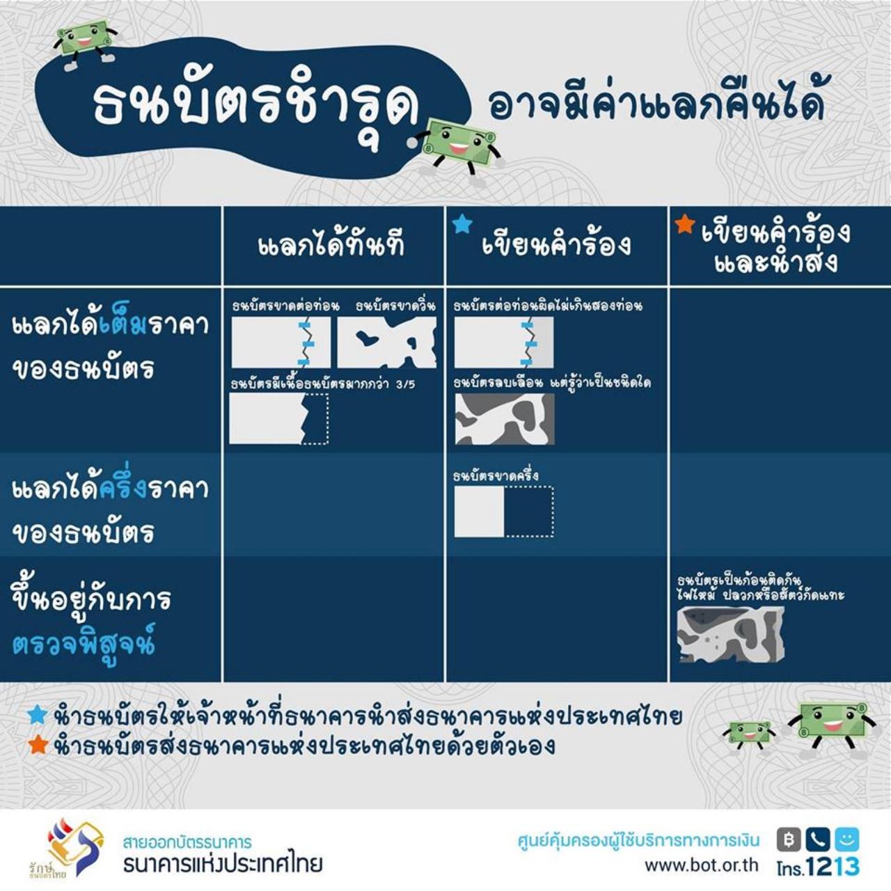 เมื่อใครได้ประสบเหตุเช่นนี้ไม่ต้องช็อกตกใจ สามารถนำธนบัตรชำรุดไปแลกได้โดยไม่เสียค่าธรรมเนียมใดๆ โดยที่ผ่านมาทางธนาคารแห่งประเทศไทย หรือแบงก์ชาติ ได้เผยแพร่ข้อมูล “ประชาชนควรทราบกรณีมีธนบัตรชำรุดเสียหาย” ระบุว่าธนบัตรชำรุดไม่เป็นเงินที่ชำระหนี้ได้ตามกฎหมาย ตามพ.ร.บ. เงินตรา พุทธศักราช 2501 มาตรา 18 จำแนกไว้ 4 ลักษณะ 1.ธนบัตรครึ่งฉบับ คือ ธนบัตรที่ถูกแยกตรงกลางหรือใกล้กับกลางเป็นสองส่วนตามยืนเท่านั้น โดยให้รับแลกเปลี่ยนแต่ละครึ่งฉบับ ได้ครึ่งราคาของราคาเต็มของธนบัตรนั้น