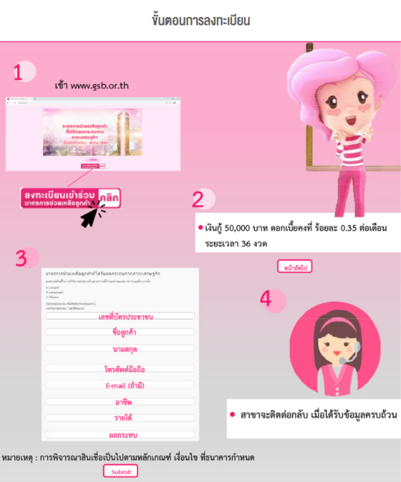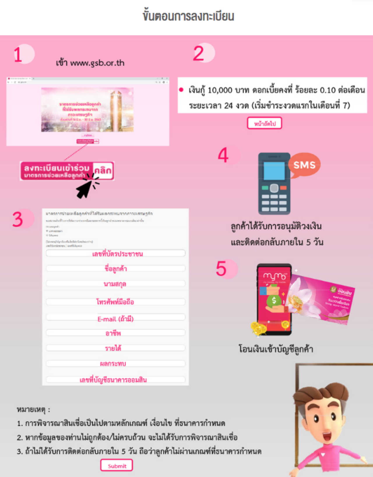 อย่างไรก็ตาม การพิจารณาสินเชื่อเป็นไปตามหลักเกณฑ์ เงื่อนไขที่ธนาคารกำหนด หากข้อมูลของท่านไม่ถูกต้อง/ไม่ครบถ้วน จะไม่ได้รับการพิจารณาสินเชื่อ และถ้าไม่ได้รับการติดต่อกลับภายใน 5 วัน ถือว่าผู้ลงทะเบียนไม่ผ่านเกณฑ์ที่ธนาคารกำหนด.