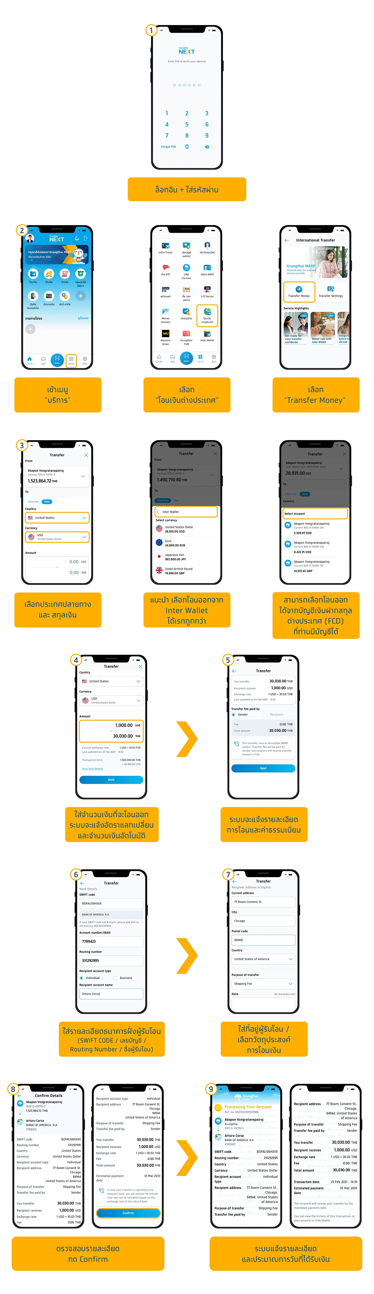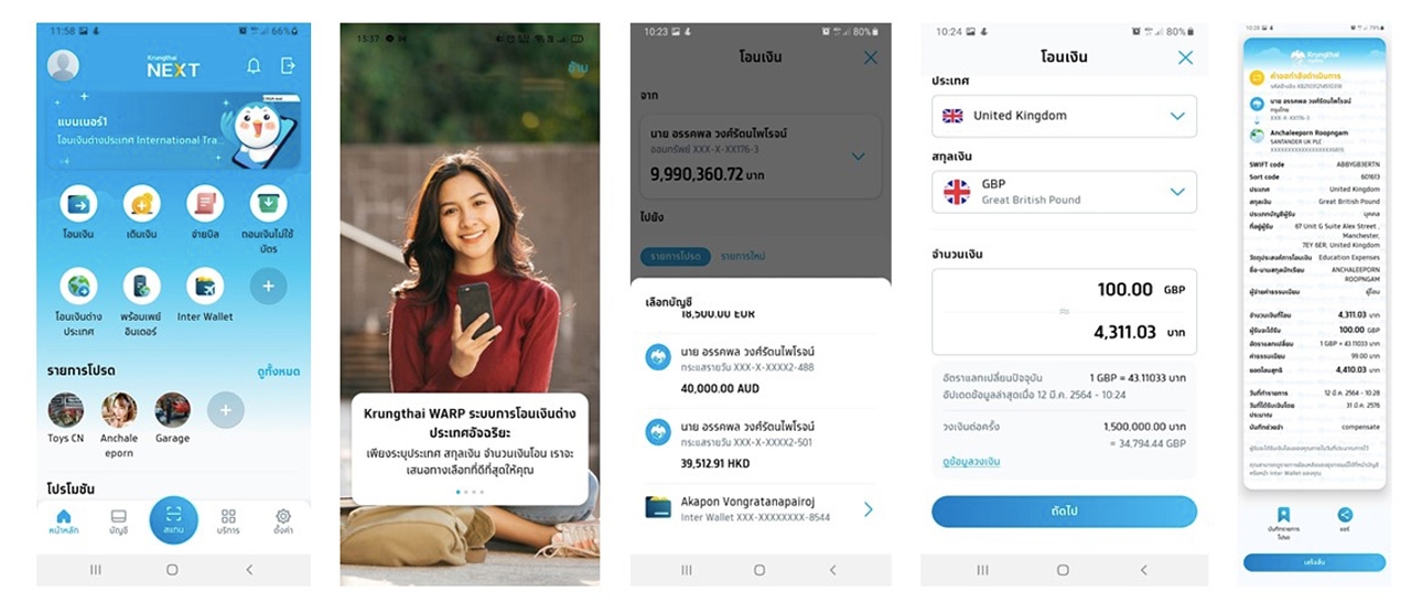 “Krungthai WARP” (กรุงไทย วาร์ป) ฟีเจอร์บริการโอนเงินต่างประเทศ บนแอปฯ Krungthai NEXT ทำได้ง่ายสะดวก รวดเร็ว จุดเด่นของฟีเจอร์นี้คือระบบจะคำนวณเลือกค่าธรรมเนียมการโอนที่ถูกที่สุดให้กับลูกค้าโดยอัตโนมัติ เพียงระบุประเทศ สกุลเงิน และจำนวนเงินที่ต้องการโอน