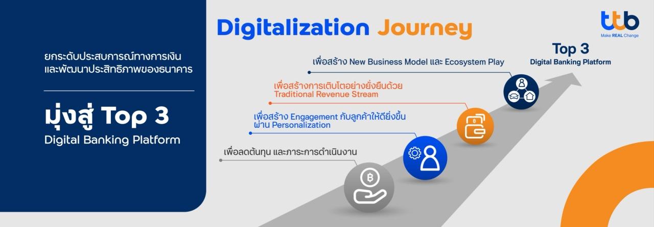 2. Digitalization: การยกระดับประสบการณ์ทางการเงินและพัฒนาประสิทธิภาพของธนาคารผ่าน ttb touch เวอร์ชันใหม่ โดยธนาคารมีเป้าหมายนำดิจิทัลมาเป็นเครื่องมือสำคัญในการส่งมอบประสบการณ์ทางการเงินที่ดียิ่งขึ้นให้กับลูกค้า และขับเคลื่อนองค์กรให้ทำงานได้อย่างมีประสิทธิภาพมากขึ้น ลดต้นทุนของธนาคาร เพิ่มขีดความสามารถในการแข่งขัน โดยมีเป้าหมายก้าวสู่การเป็น Top 3 Digital Banking Platform