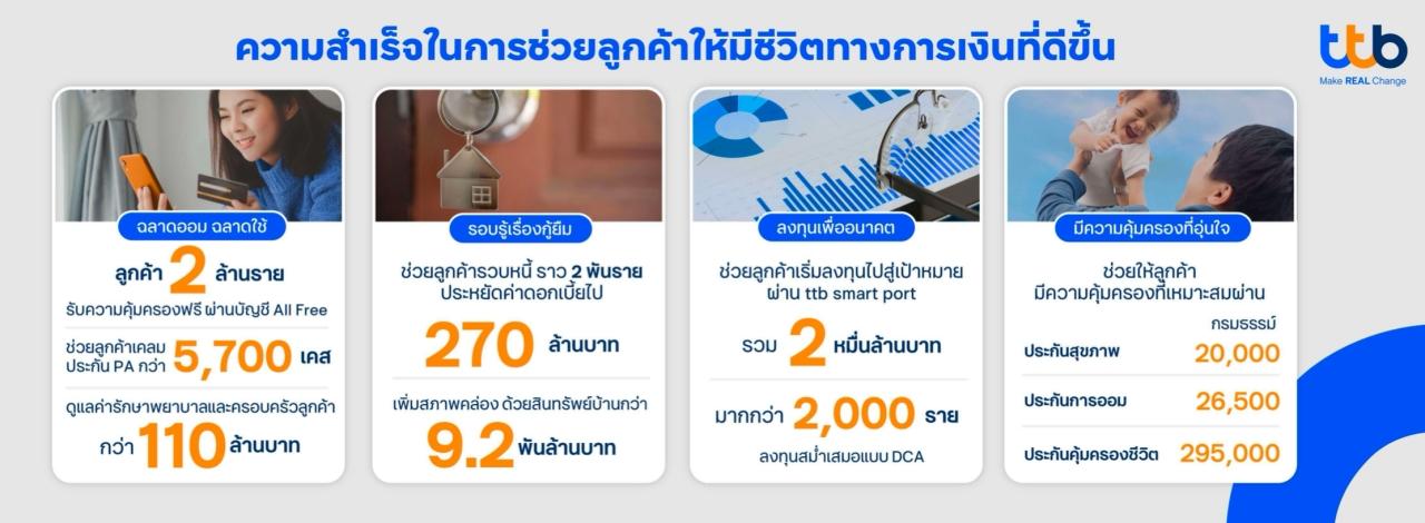 ทั้งนี้ ตั้งแต่รวมกิจการ ทีเอ็มบีธนชาตได้ส่งมอบชีวิตทางการเงินที่ดีขึ้นให้กับลูกค้ามากมายผ่านโซลูชันทางการเงินที่ตอบโจทย์และเป็นประโยชน์ อาทิ การได้ช่วยให้คนไทยกว่า 2 ล้านคน ได้มีความคุ้มครองชีวิตและค่ารักษาพยาบาลจากอุบัติเหตุฟรี ผ่านบัญชี ttb all free