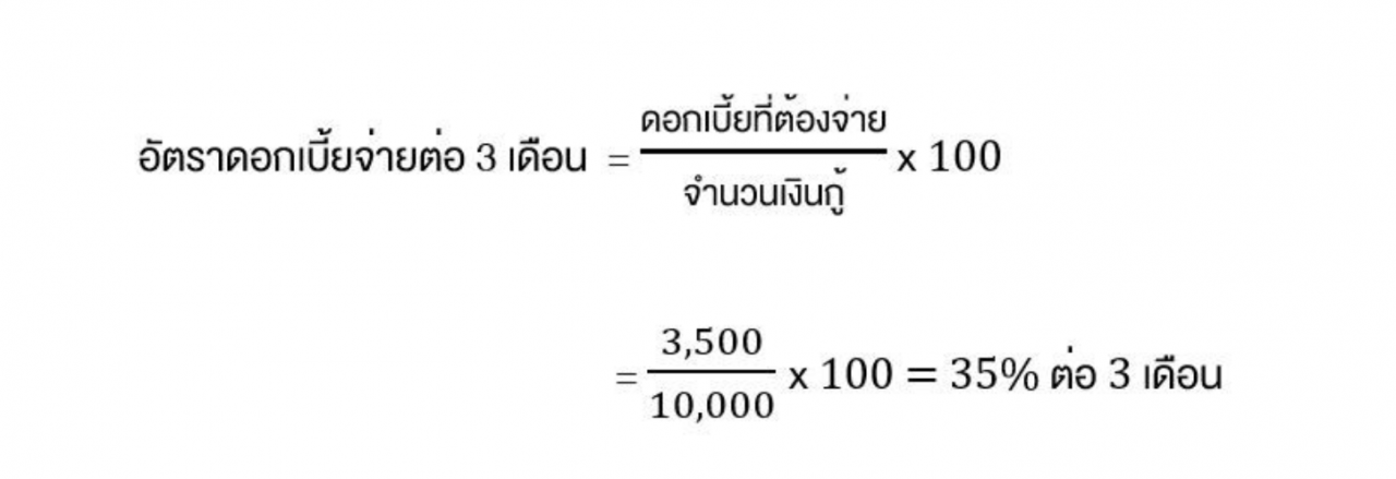 เช่น กู้เงิน 10,000 บาท จ่ายคืนวันละ 150 บาท เป็นเวลา 3 เดือน แต่จริงๆแล้ว 150 × 30 x 3 ทำให้เราต้องคืนเงินทั้งหมด 13,500 บาท เป็นดอกเบี้ย จำนวน 3,500 บาท
