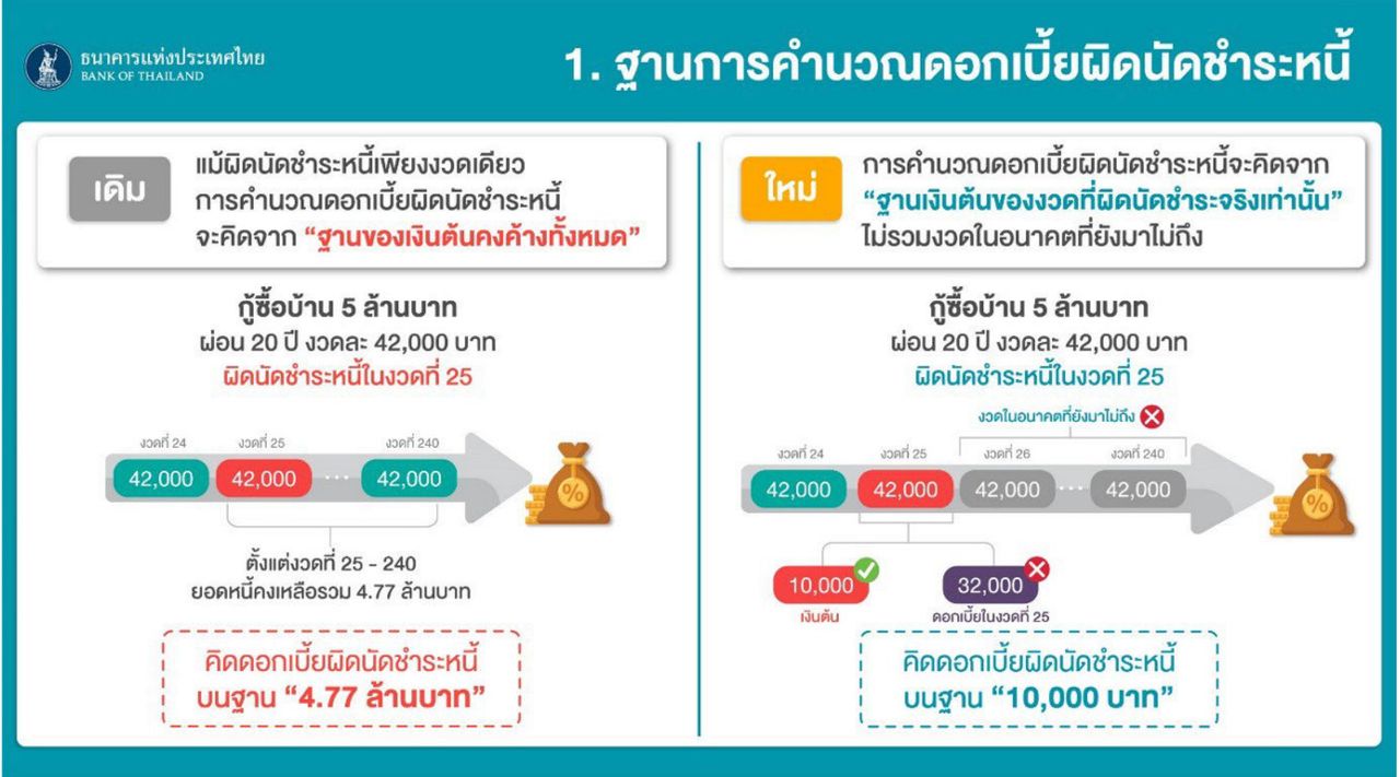 ขณะ ธนาคารแห่งประเทศไทย (ธปท.) ได้ยกอีกตัวอย่างไว้ให้เห็นภาพชัดเจน เช่น เมื่อกู้ซื้อบ้าน 5 ล้านบาท โดยผ่อนงวดละ 42,000 บาท มีเงินต้น 10,000 บาท ดอกเบี้ย 32,000 บาท หากผิดนัดชำระในงวดที่ 25 จะคิดดอกเบี้ยผิดนั้นแค่งวดที่ 25 ไม่รวมงวด 26 และงวดต่อ ๆ ไป และดอกเบี้ยผิดนัดจะคิดบนฐาน 10,000 บาท