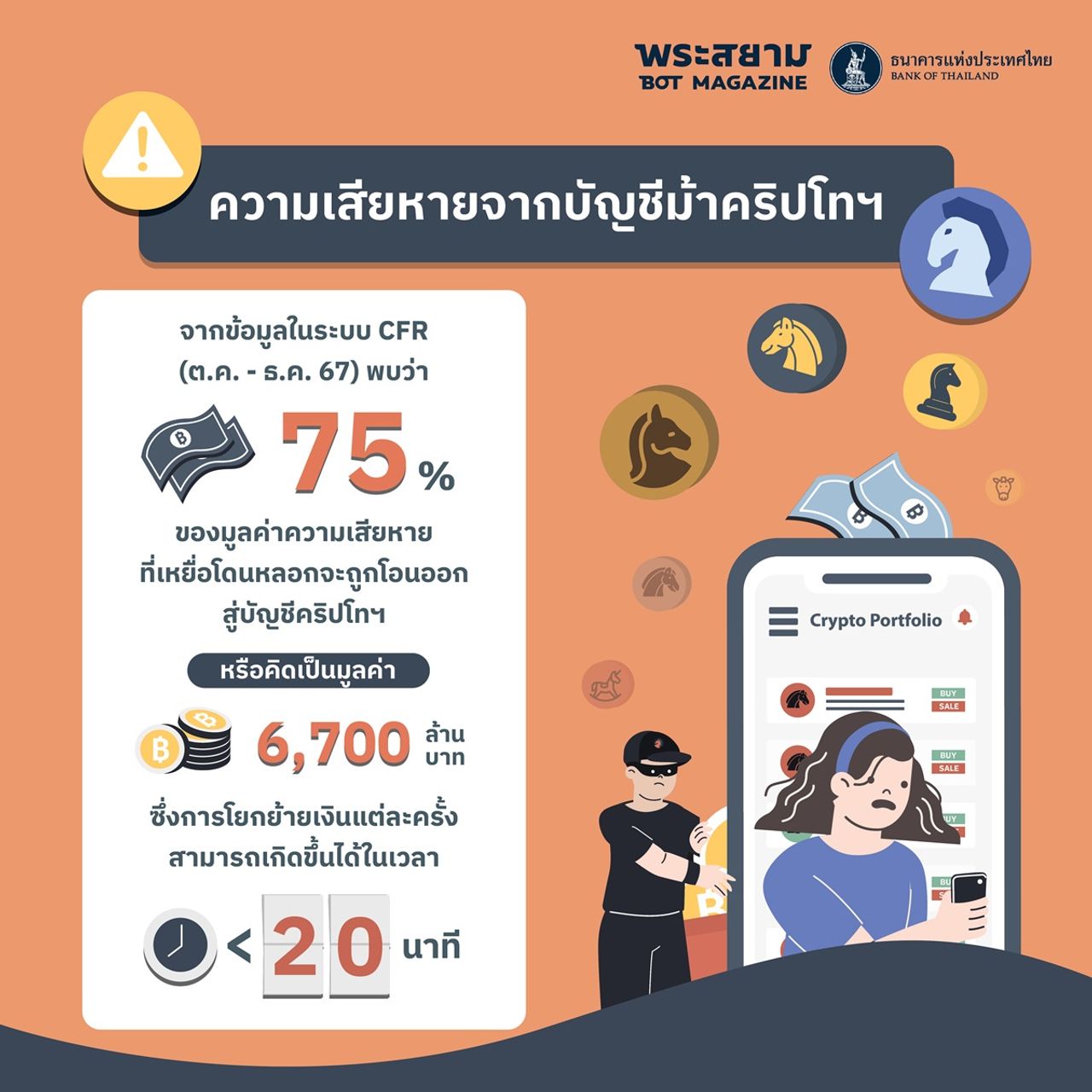 ธปท. รายงานว่า จากข้อมูลในระบบ Central Fraud Registry (CFR) พบว่าช่วงเดือนตุลาคม-ธันวาคม 2567 เพียง 3 เดือน มิจฉาชีพใช้บัญชีคริปโตเคอร์เรนซีเป็นช่องทางหลักในเส้นทางเงินทุจริต โดย 75% ของมูลค่าความเสียหายทั้งหมด หรือเท่ากับ 6,700 ล้านบาท ถูกแปลงสภาพจากเงินบาทเป็นคริปโตฯ