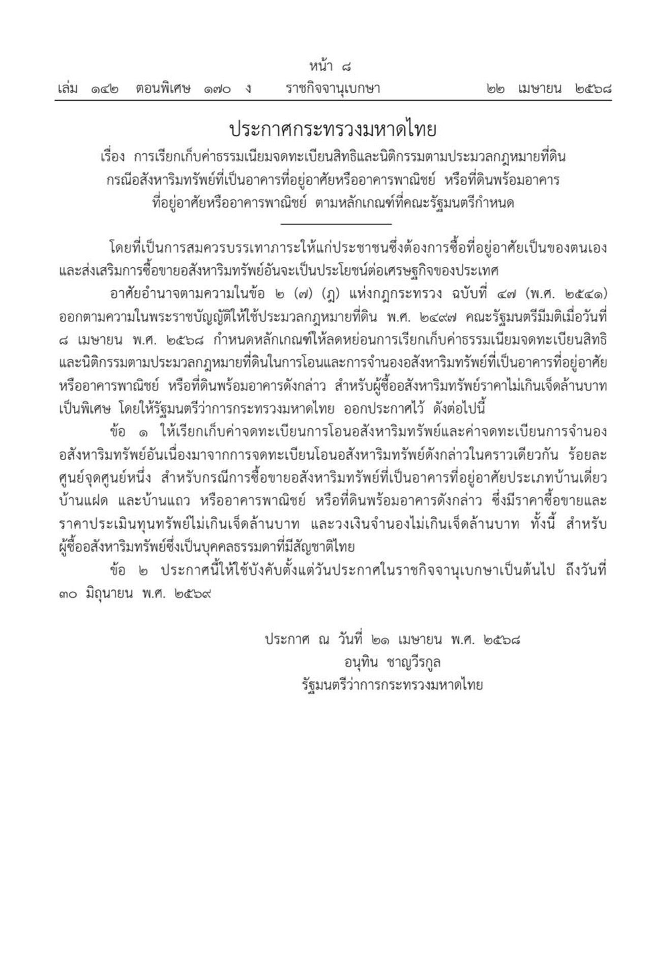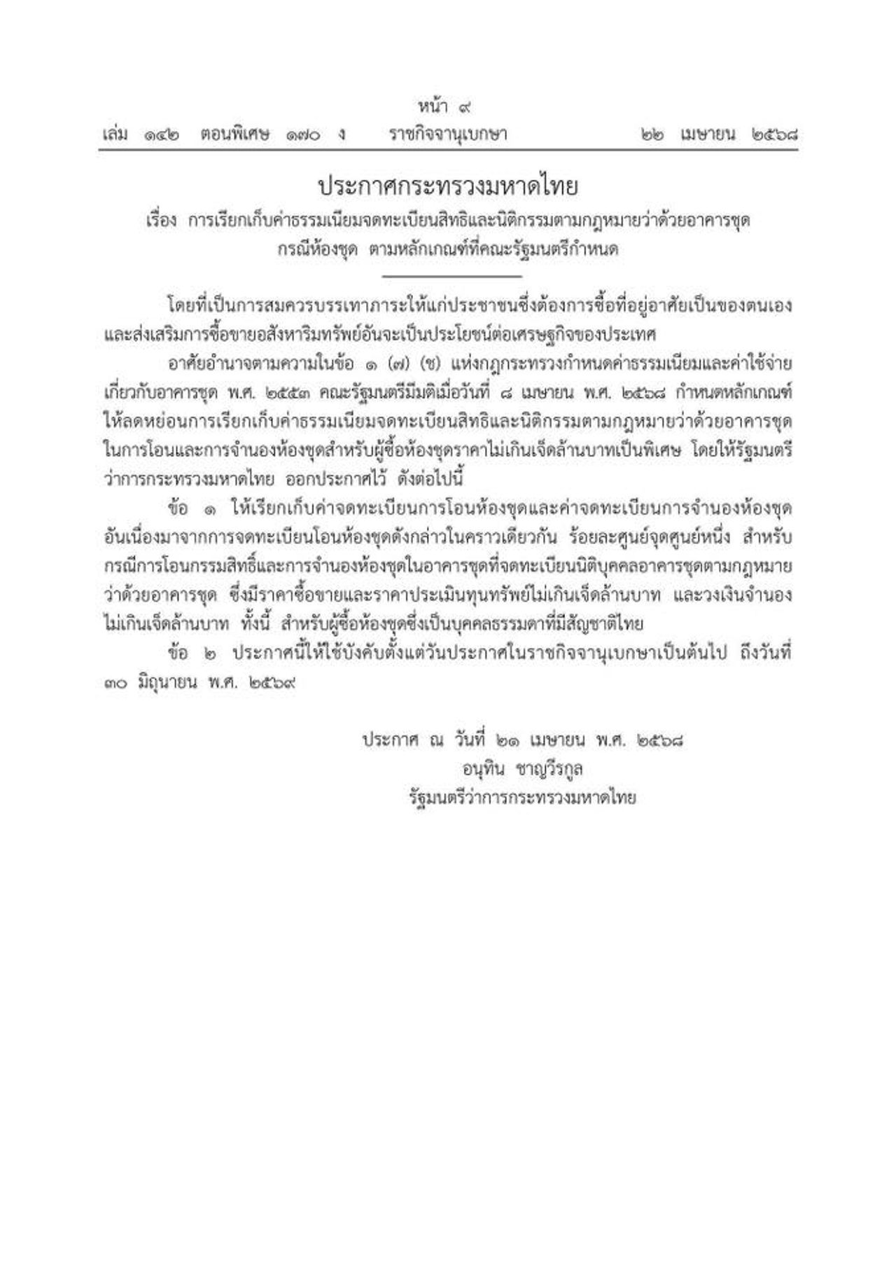 โดยในรายละเอียดระบุ วานนี้ (21 เม.ย.2568) “อนุทิน ชาญวีรกุล” รัฐมนตรีว่าการกระทรวงมหาดไทย ลงนามในประกาศกระทรวงมหาดไทย เรื่อง การเรียกเก็บค่าธรรมเนียม จดทะเบียนสิทธิ และ นิติกรรมตามประมวลกฎหมายที่ดิน กรณีอสังหาริมทรัพย์ทื่เป็นอาคารที่อยู่อาศัย หรือ อาคารพาณิชย์ หรือ ที่ดินพร้อมอาคารที่อยู่อาศัยหรืออาคารพาณิชย์ ตามหลักเกณฑ์ที่คณะรัฐมนตรี อนุมัติเมื่อ วันที่ 8 เม.ย.2568 เพื่อส่งเสริมการซื้อ-ขาย อสังหาริมทรัพย์ อันจะเป็นประโยชน์ต่อเศรษฐกิจของประเทศ